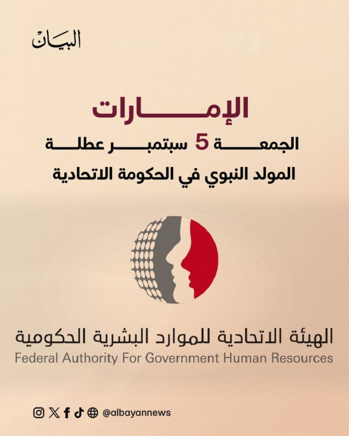ودونت الهيئة عبر حسابها على منصة "إكس" : "أصدرت الهيئة تعميماً إلى كافة الوزارات والجهات الاتحادية بشأن عطلة المولد النبوي الشريف في الحكومة الاتحادية، للعام 1447هــ. وبناء على التوجهات الصادرة في هذا الشأن، فقد تقرر أن تكون عطلة المولد النبوي الشريف يوم الجمعة الموافق 5 سبتمبر 2025 .".