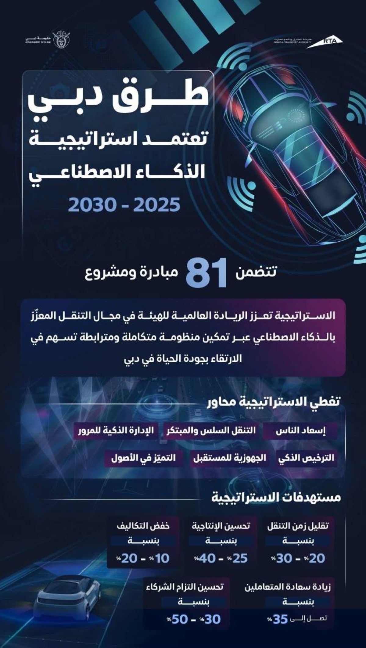 اعتمدت هيئة الطرق والمواصلات ضمن فعاليات أسبوع دبي للذكاء الاصطناعي، استراتيجية الذكاء الاصطناعي 2030، التي تهدف إلى تعزيز الريادة العالمية للهيئة في مجال التنقل المعزّز بالذكاء الاصطناعي، عبر تمكين منظومة متكاملة ومترابطة تسهم في الارتقاء بجودة الحياة في دبي، وتتضمن الاستراتيجية 81 مشروعاً ومبادرة، تغطي ستة محاور: إسعاد الناس، والتنقل السهل والمبتكر، والإدارة الذكية للحركة المرورية، والترخيص الذكي، والجهوزية للمستقبل، والتميّز في الأصول.