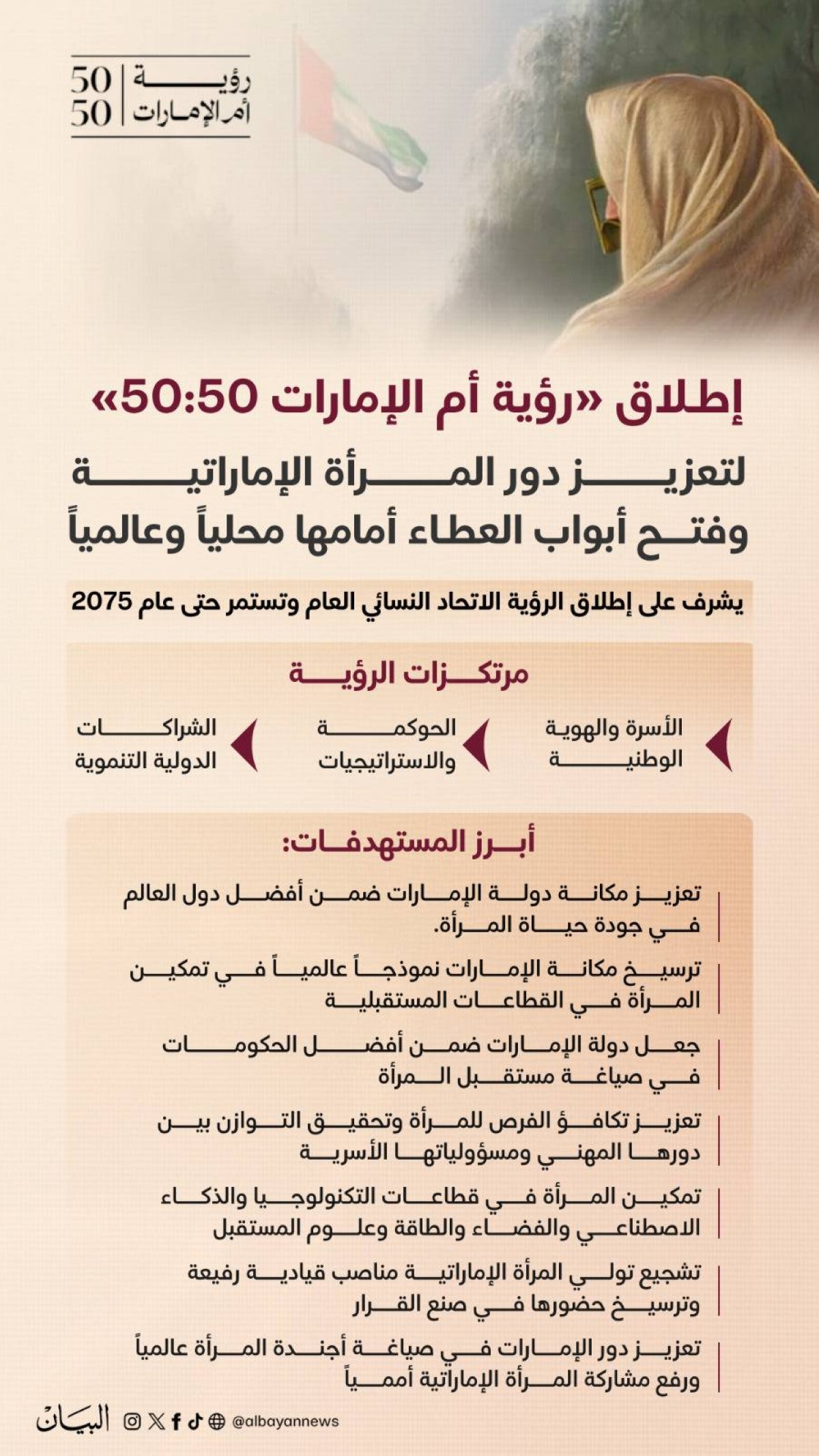 وتمثل " رؤية أم الإمارات 50:50"، تجسيداً حياً لفكر أم الإمارات سمو الشيخة فاطمة بنت مبارك في تمكين المرأة الإماراتية لتكون شريكاً رئيسياً في المسيرة التنموية لدولة الإمارات والعالم، وبما يعكس طموح الإمارات في أن تصبح المرأة نموذجاً عالمياً في التأثير والإلهام، وتُعد رسالة تنموية تتجاوز الحدود، ودعوة إلى الشراكة والعمل والابتكار، لضمان حضور المرأة الإماراتية في قلب المستقبل، بما ينسجم مع تطلعات مئوية الإمارات 2071، والسير بثقة نحو 2075.