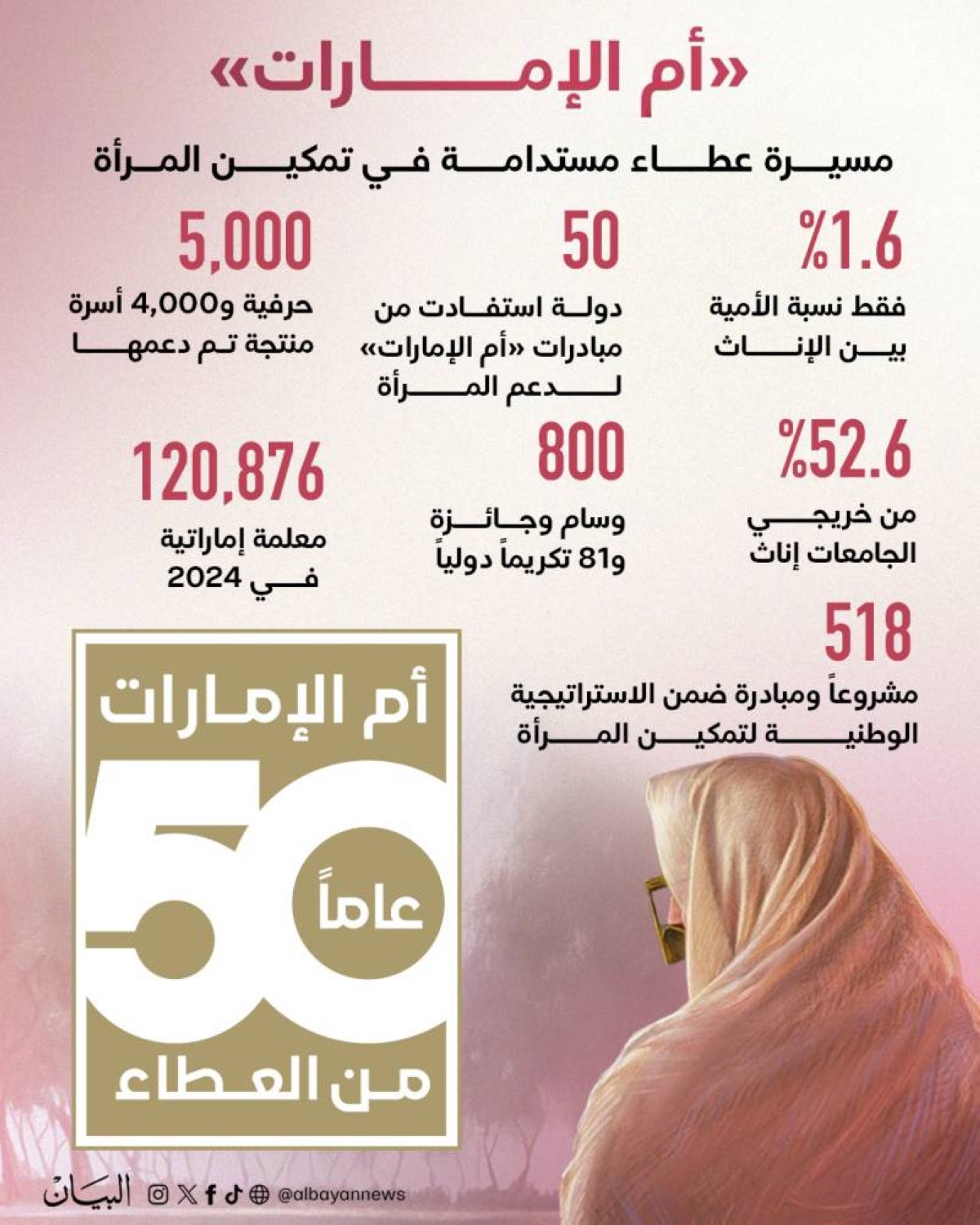 واليوم، يُترجم هذا المسار الريادي بواقع ملموس، حيث تبلغ نسبة تمثيل المرأة 50% في المجلس الوطني الاتحادي، لتواصل الإمارات بقيادة "أم الإمارات" ترسيخ مكانة المرأة كشريك رئيسي في التنمية الشاملة وصناعة المستقبل، ونموذج عالمي ملهم في التمكين والاستدامة.