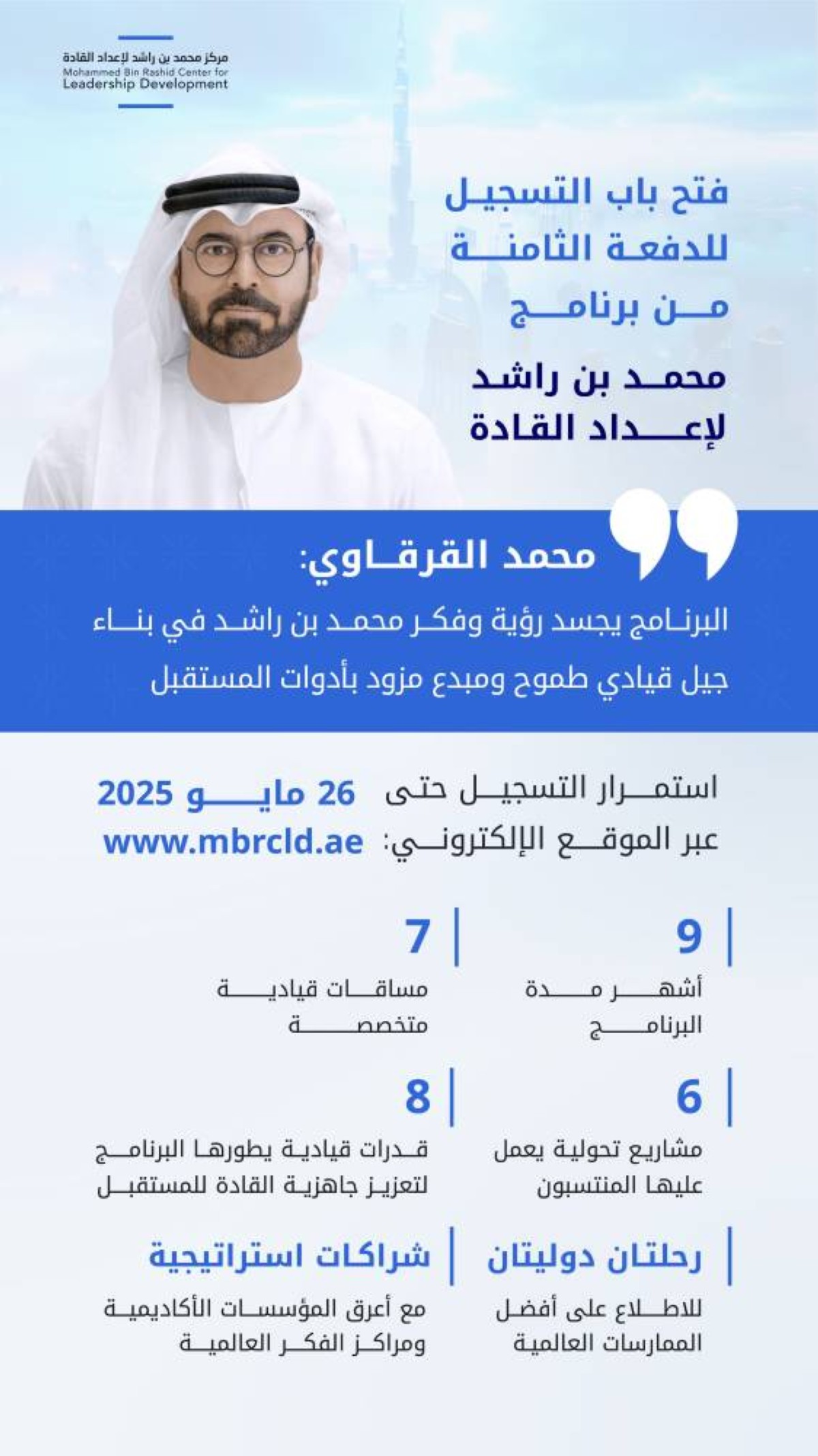 أعلن مركز محمد بن راشد لإعداد القادة، التابع للمكتب التنفيذي لصاحب السمو الشيخ محمد بن راشد آل مكتوم، نائب رئيس الدولة رئيس مجلس الوزراء حاكم دبي “رعاه الله”، عن فتح باب التسجيل للدفعة الثامنة من برنامج "محمد بن راشد لإعداد القادة"، الهادف إلى إعداد قيادات إماراتية قادرة على إدارة المشاريع الإستراتيجية والتحولية، ومواكبة التغيرات العالمية المتسارعة في مختلف القطاعات الحيوية.
