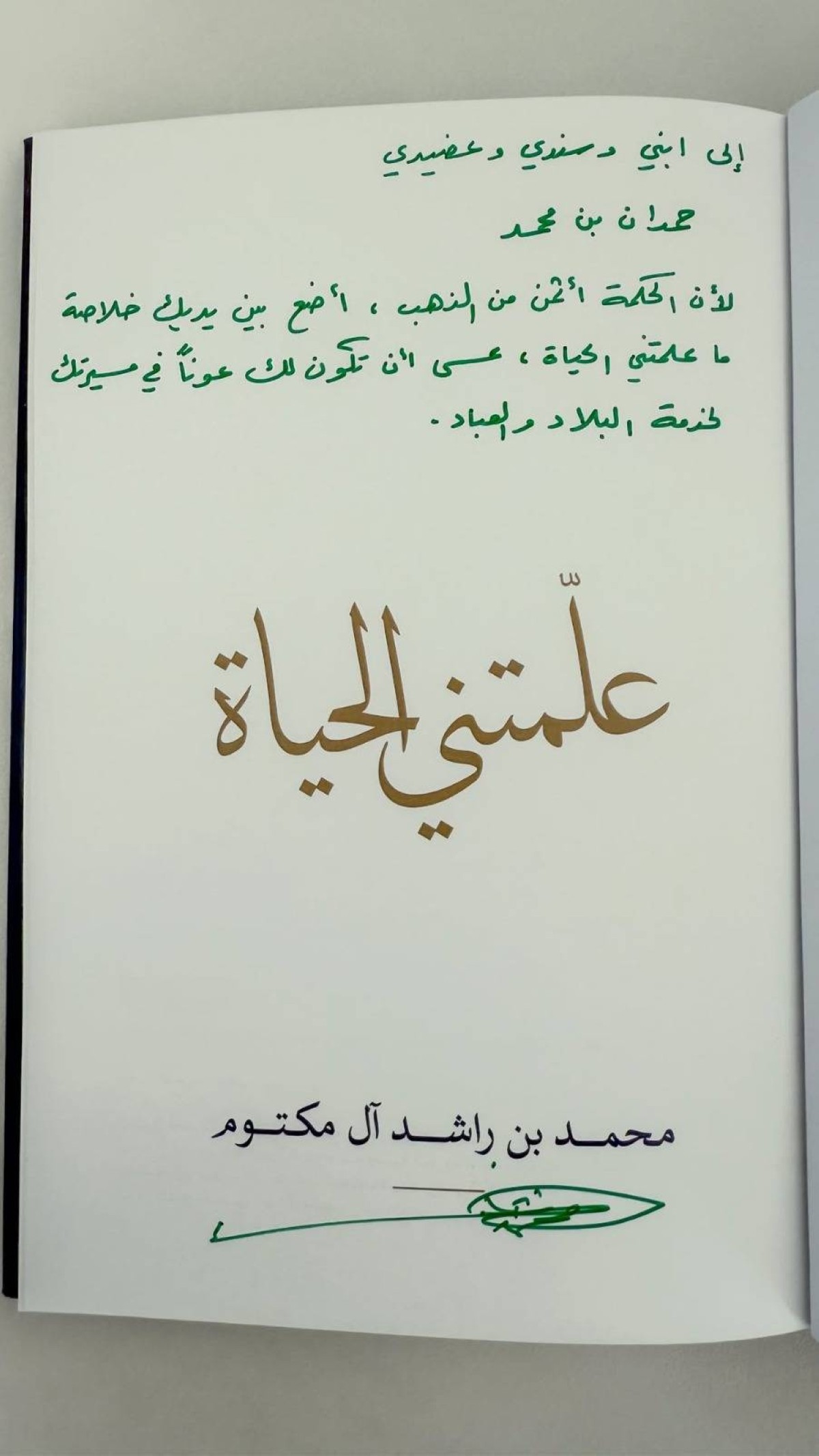 وأمهر صاحب السمو الشيخ محمد بن راشد آل مكتوم نسخة كتاب "علمتني الحياة " الخاصة، بسمو الشيخ حمدان بن محمد بكلمات من ذهب جاء فيها: "إلى ابني وسندي وعضيدي، حمدان بن محمد، لأن الحكمة أثمن من الذهب، أضع بين يديك خلاصة ما علمتني الحياة، عسى أن تكون لك عوناً في مسيرتك لخدمة البلاد والعباد".