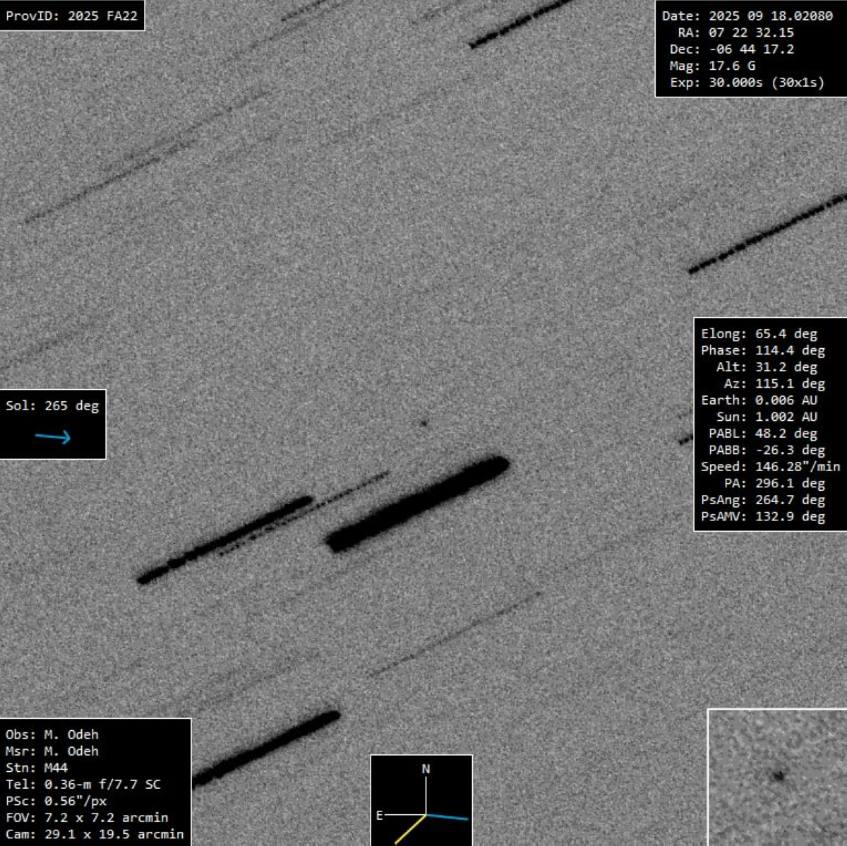 وأشار إلى أن الكويكب كان يتحرك بسرعة كبيرة بلغت 2.5 دقيقة قوسية في الدقيقة الواحدة، أي بما يعادل قطر القمر كل 12 دقيقة، الأمر الذي يجعل عملية رصده شديدة الصعوبة.