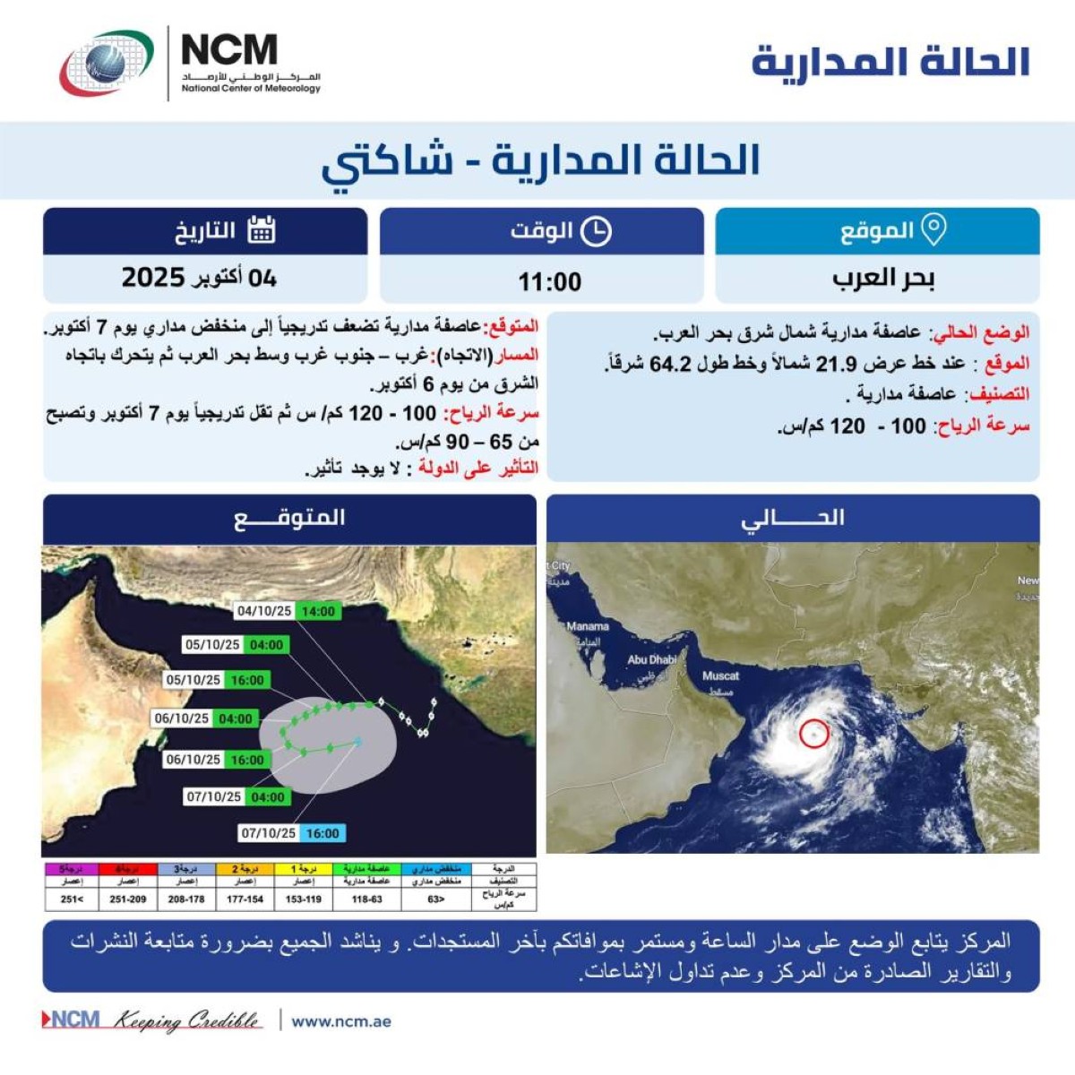 أصدر المركز الوطني للأرصاد تقريرا حول الحالة المدارية “شاكتي” التي تصنف حاليا كـ"عاصفة مدارية" شمال شرق بحر العرب وتتمركز عند خط عرض 21.9 شمالا وخط طول 64.2 شرقا مع سرعة رياح تتراوح بين 100 و120 كم/س.