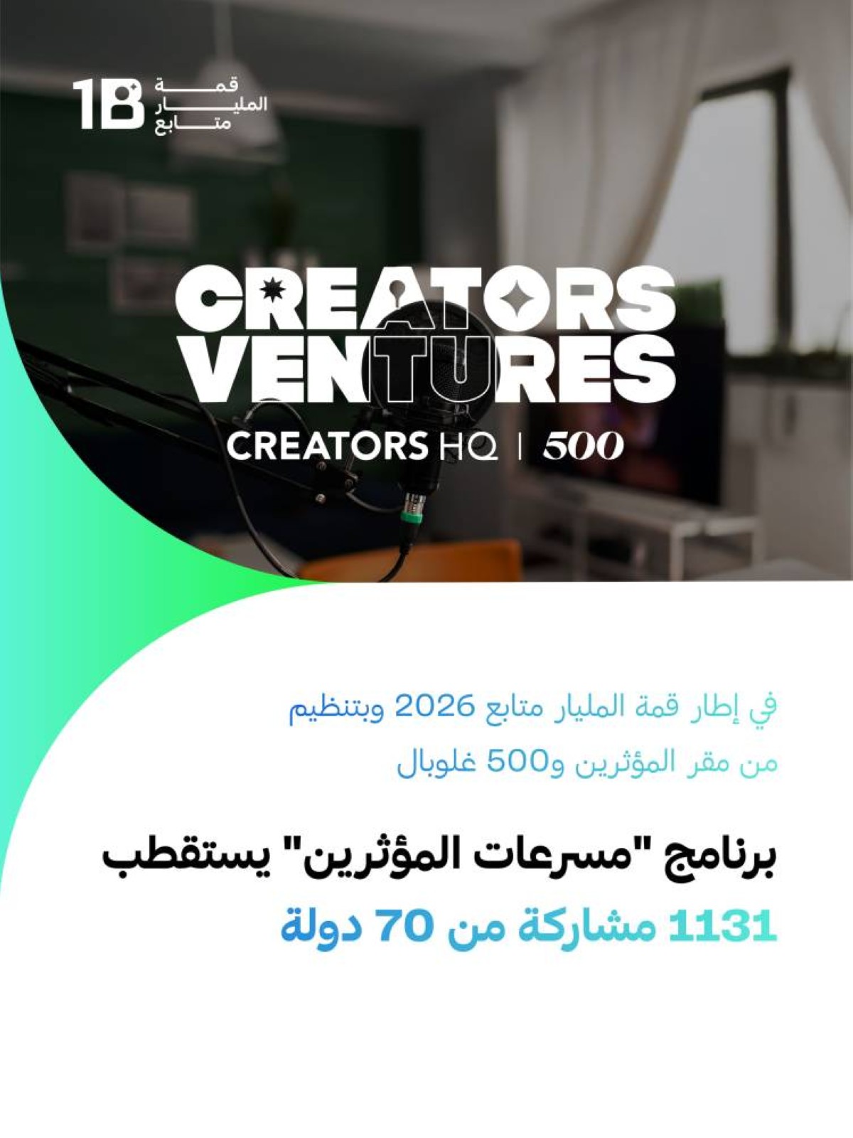 أعلنت "قمة المليار متابع"، أكبر قمة عالمية في اقتصاد صناعة المحتوى، التي ينظمها المكتب الإعلامي لحكومة دولة الإمارات، أن برنامج "مسرعات المؤثرين"، ضمن النسخة الثانية من برنامج "الاستثمار مع صناع المحتوى"، الذي ينظمه "مقر المؤثرين"، الذي ينضوي تحت مظلة مجموعة "فيجينيرز"، بالتعاون مع شركة "500 جلوبال"، استقطب 1131 مشاركة من صناع محتوى وشركات رقمية ناشئة عاملة في قطاع صناعة المحتوى، ينتمون إلى أكثر من 70 دولة.