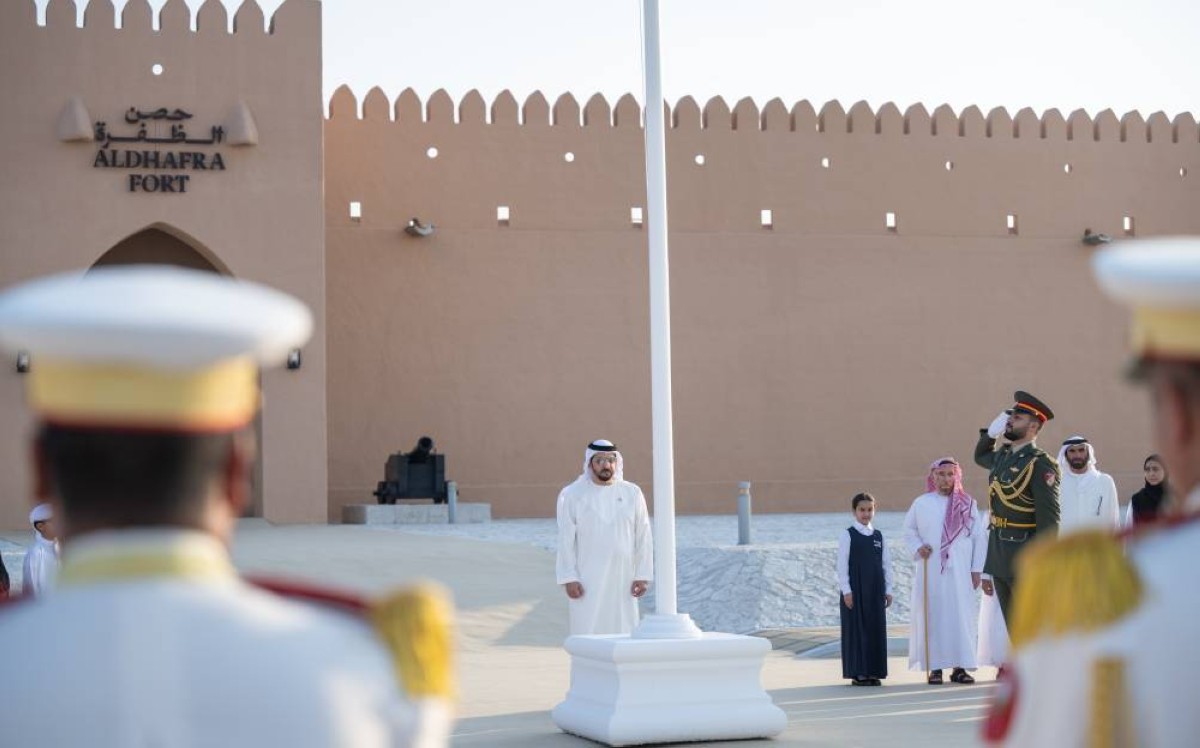 رفع سمو الشيخ حمدان بن زايد آل نهيان، ممثل حاكم أبوظبي في منطقة الظفرة، علم دولة الإمارات العربية المتحدة في حصن الظفرة، احتفالاً بيوم العلم، الذي يصادف الثالث من نوفمبر من كل عام.