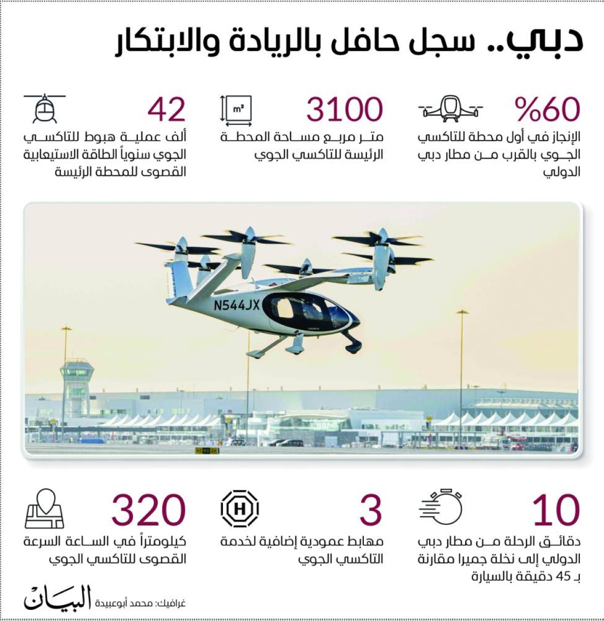 نفذت هيئة الطرق والمواصلات بالتعاون مع شركة "جوبـي أفييشن"، أول رحلة مأهولة للتاكسي الجوي الكهربائي للإقلاع والهبوط العمودي:(eVTOL) بين موقعين مختلفين، حيث انطلق التاكسي الجوي الكهربائي، من موقع اختبارات جوبي في مرغم إلى مطار آل مكتوم: (دبي ورلد سنترال) في رحلة استغرقت 17 دقيقة، وذلك تزامناً مع فعاليات معرض دبي للطيران 2025، وبهذه العملية تصبح "جوبي" أول شركة في العالم تُنفّذ رحلة مأهولة بتاكسي جوي كهربائي للإقلاع والهبوط العمودي بين نقطتين مختلفتين داخل دولة الإمارات، وأعلنت الهيئة إنجاز شركة "سكاي بورتس إنفراستركتشر"، البريطانية المتخصصة في تطوير البنية التحتية للتنقّل الجوي المتقدّم، 60% من أعمال إنشاء أول محطة للإقلاع والهبوط العمودي للتاكسي الجوي في الإمارة، بالقرب من مطار دبي الدولي (DXB)، حيث وصلت أعمال البناء إلى أعلى نقطة في المحطة التي تعد الأول من نوعها على مستوى العالم.