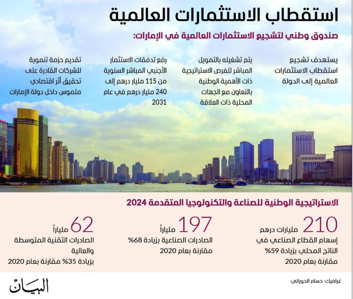 وأضاف سموه: «ضمن أجندة مجلس الوزراء، اعتمدنا إنشاء الصندوق الوطني للاستثمار برأس مال مبدئي قدره 36.7 مليار درهم قابل للزيادة والمراجعة.. والهدف من الصندوق تشجيع الاستثمارات الأجنبية المباشرة الواردة للدولة عبر حزم مالية تحفيزية وتحقيق مستهدفاتنا برفعها من 115 مليار درهم سنوياً إلى 240 مليار درهم سنوياً في 2031، ورفع رصيدها المتراكم من 800 مليار إلى 2.2 تريليون درهم في نفس العام.. رسالتنا واضحة لكافة المستثمرين حول العالم.. دولة الإمارات ترحب بكم... ودولة الإمارات ستوفر أفضل بيئة لاستثماراتكم... ودولة الإمارات ستدعم نموكم ونجاحكم المستقبلي».