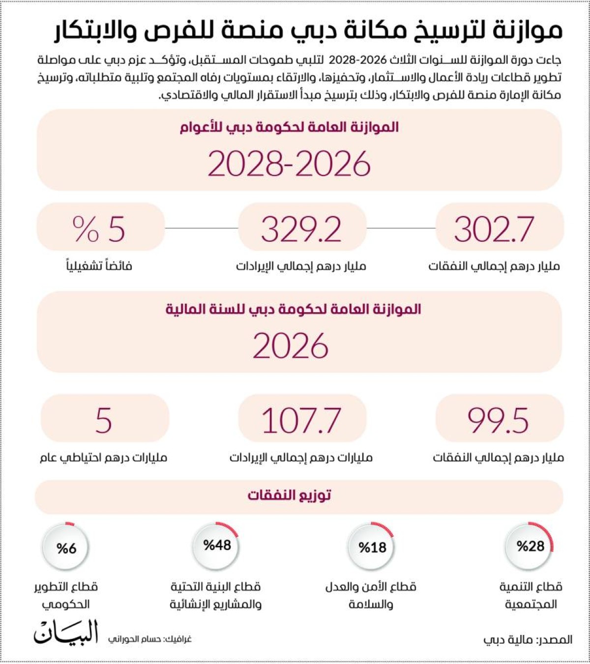 وتُقدَّر النفقات للعام المالي 2026 بإجمالي قدره 99.5 مليار درهم، في تعبير واضح عن مواصلة الإمارة دعم المشاريع التنموية وتحفيز الاقتصاد الكُليّ وتحقيق الأهداف الطموحة لخطة دبي 2033 وأجندة دبي الاقتصادية D33. وتواصل دبي في موازنة العام 2026 الاهتمام بالخدمات الاجتماعية وتطوير قطاعات الصحة وقطاع التعليم والثقافة والمشروعات الإنشائية، وتخصيص التمويل اللازم لها وفق الأولويات، ووضع إطار للحوكمة تم إطلاقه وتعميمه على جميع الجهات الحكومية.