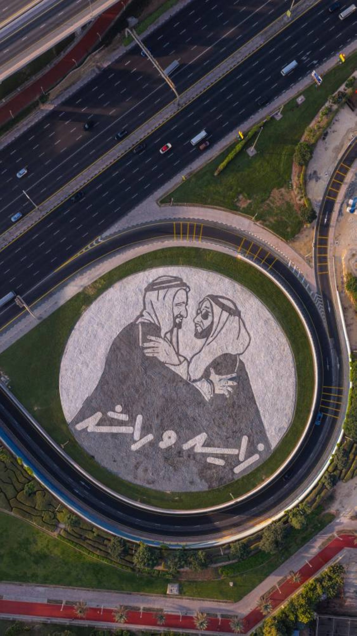 وقد تم تنفيذ العمل الفني الذي يحمل صورة الشيخ زايد والشيخ راشد، رحمهما الله تعالى، على مجسم أرضي ضخم قطره 82 متراً أمام مبنى "البرواز" في إضافة إبداعية تحمل معاني ورسائل وطنية مهمة ضمن رؤية شاملة تحتفي بتاريخ الإمارات وتستشرف مستقبلها المزدهر.