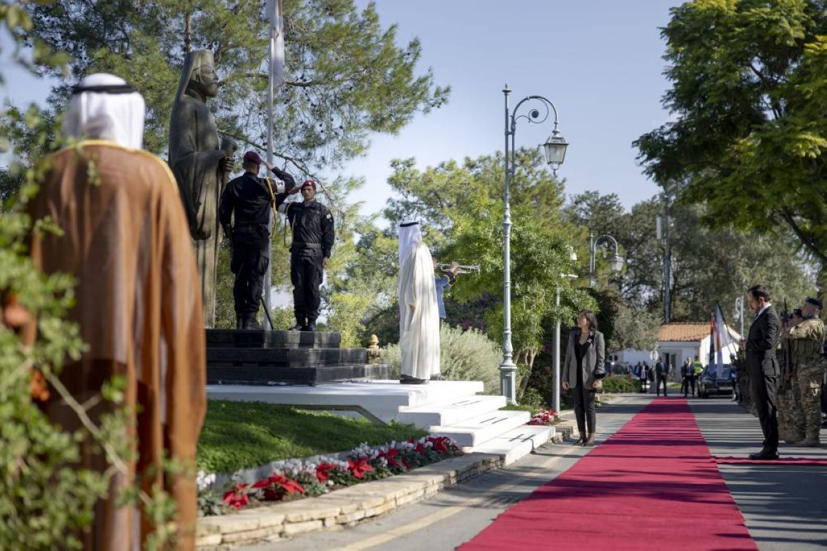 كما وضع سموه خلال المراسم إكليلا من الزهور على النصب التذكاري لمكاريوس الثالث الرئيس المؤسس لجمهورية قبرص.