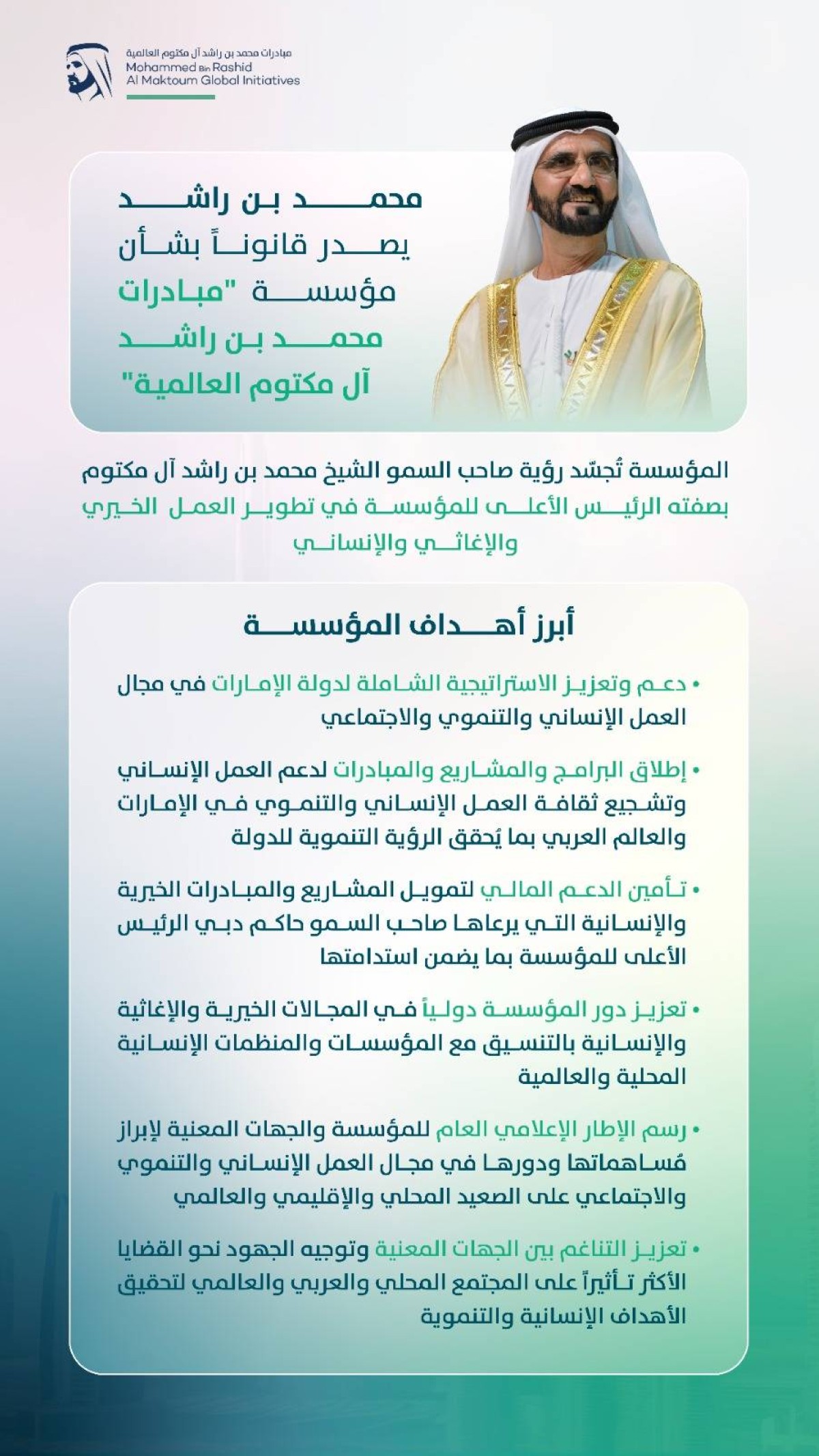 أصدر صاحب السمو الشيخ محمد بن راشد آل مكتوم، نائب رئيس الدولة، رئيس مجلس الوزراء، رعاه الله، بصفته حاكماً لإمارة دبي، القانون رقم 12 لسنة 2025 بشأن مؤسسة "مبادرات محمد بن راشد آل مكتوم العالمية"، متضمناً أهدافها واختصاصاتها والجهات المعنية، حيث تجسد المؤسسة رؤية صاحب السمو الشيخ محمد بن راشد آل مكتوم بصفته الرئيس الأعلى للمؤسسة في تطوير العمل الخيري والإغاثي والإنساني.