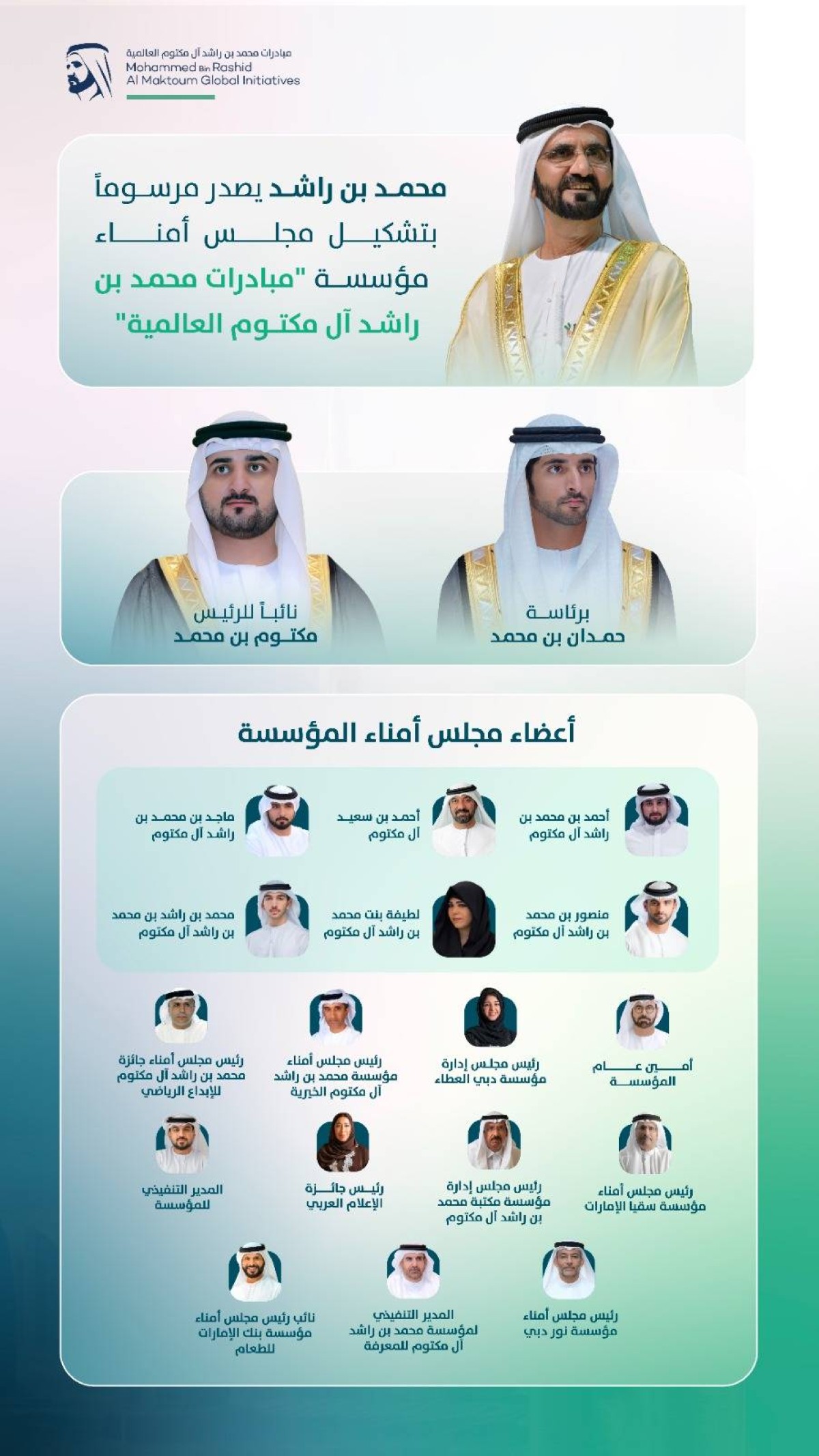 كما أصدر صاحب السمو الشيخ محمد بن راشد آل مكتوم، المرسوم رقم 43 لسنة 2025 بتشكيل مجلس أمناء مؤسسة "مبادرات محمد بن راشد آل مكتوم العالمية"، والذي نص على أن يشكل مجلس أمناء المؤسسة برئاسة سمو الشيخ حمدان بن محمد بن راشد آل مكتوم، وعضوية سمو الشيخ مكتوم بن محمد بن راشد آل مكتوم، نائباً للرئيس.