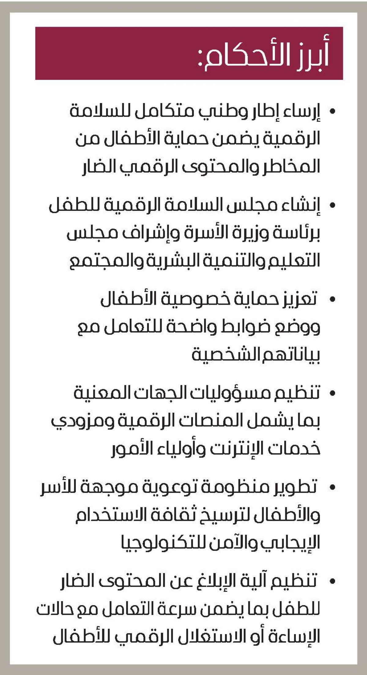 وعدم إنشاء حسابات للأطفال على المنصات الرقمية إن لم تكن متوافقة مع فئته العمرية، والامتناع عن الاستغلال السلبي للأطفال عبر المنصات الرقمية أو في العالم الافتراضي بما يُهدد خصوصيتهم أو سلامتهم النفسية والاجتماعية أو يجعلهم عرضة للتنمر، وتوعية الأطفال بثقافة الاستخدام الآمن والمسؤول للتكنولوجيا.