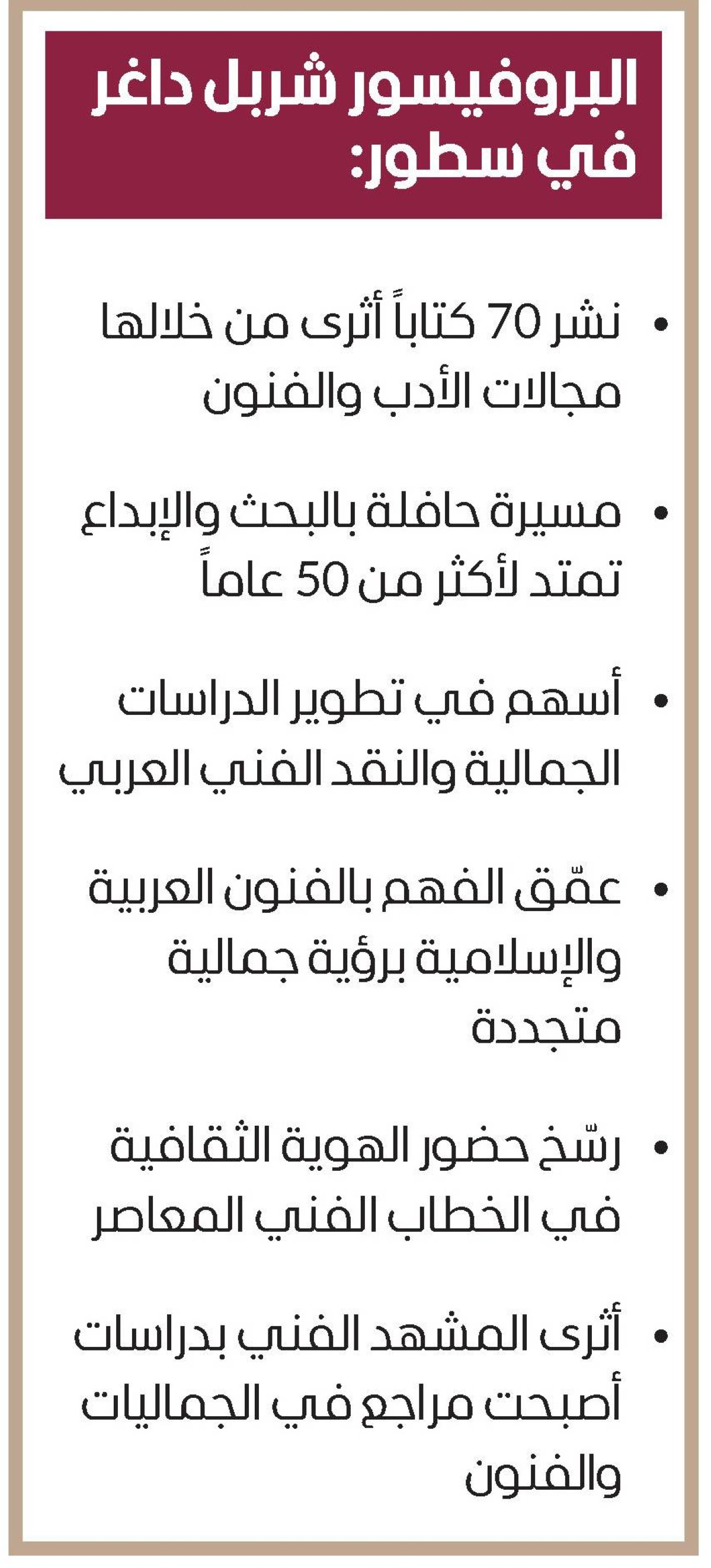 وأضاف سموه: «نشر البروفيسور شربل أكثر من 70 كتاباً، أثرى من خلالها مجالات الأدب والفنون في عالمنا العربي، وتعد مؤلفاته مراجع لدراسة الأدب والفن العربي عبر التاريخ..