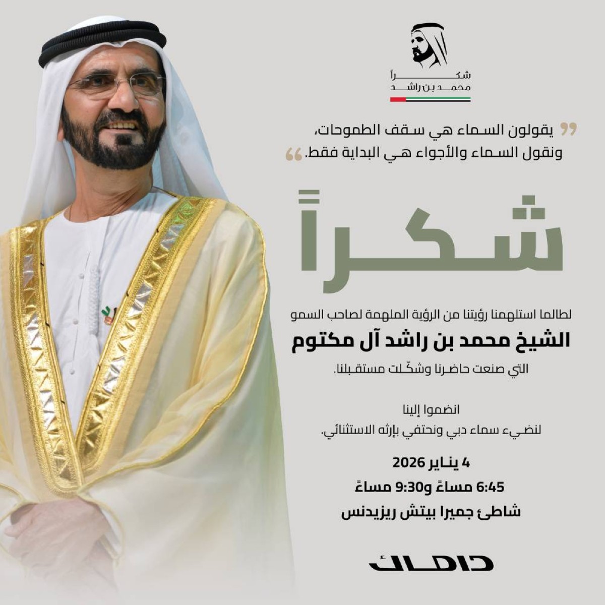 وفي الرابع من شهر يناير الحالي، الذي يصادف الذكرى العشرين لتولي سموه مقاليد الحكم في دبي، ستضيئ داماك سماء دبي بعرضين ضوئيين مبهرين لآلاف الطائرات المسيّرة (الدرون)، التي سترسم لوحات فنية تجسد رحلة دبي من رمال الصحراء إلى أفق متألق بالعمران. وستُقام عروض الدرون في منطقة شاطئ جميرا بيتش ريزدنس وأماكن أخرى في إمارة دبي عند الساعة 6:45 مساءً و9:30 مساءً.