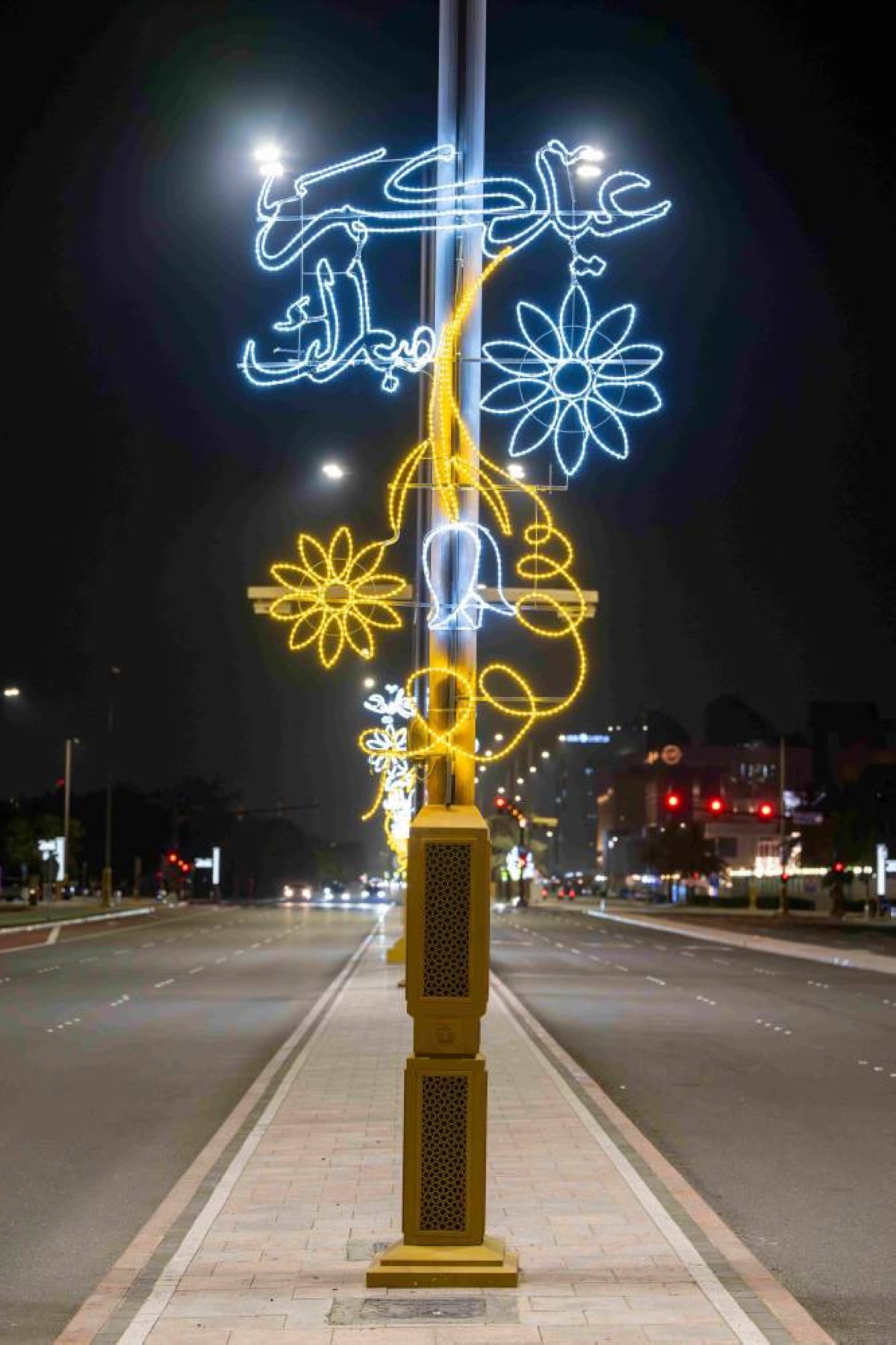 حيث تم دمج هذه المجسمات بعبارات المعايدة والتهنئة بالعيد، لتزيين الجسور وأعمدة الإنارة عند الكثير من التقاطعات بالطرق الرئيسية والفرعية داخل وخارج جزيرة أبوظبي، احتفاءً بهذه المناسبة الغالية.