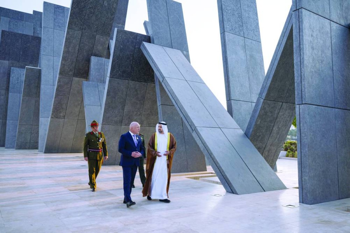 واستعرض رئيس وزراء نيوزيلندا، يرافقه سموّ الشيخ ذياب بن محمد بن زايد آل نهيان، حرس الشرف الذي اصطف لتحيته، ثم وضع إكليلاً من الزهور أمام نصب الشهيد.