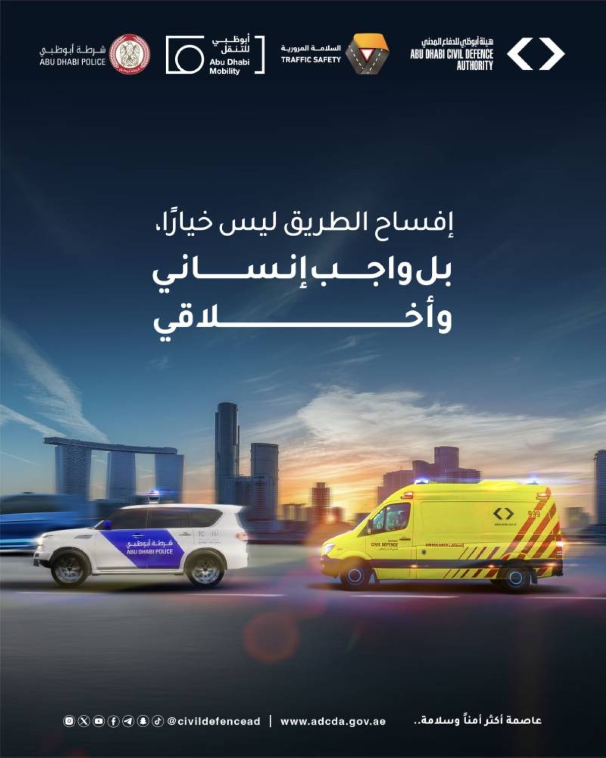 أطلقت هيئة أبوظبي للدفاع المدني، تحت مظلة اللجنة المشتركة للسلامة المرورية في إمارة أبوظبي، حملة «إفساح الطريق لمركبات الطوارئ»، بالتعاون مع القيادة العامة لشرطة أبوظبي، ودائرة البلديات والنقل ممثلة في مركز النقل المتكامل (أبوظبي للتنقل).