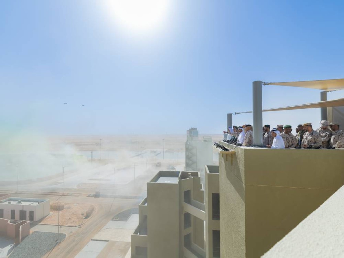 سموه متوسطاً القوات المشاركة في التمرين بحضور أحمد بن طحنون وذاكر حسنوف وكريم ولييف