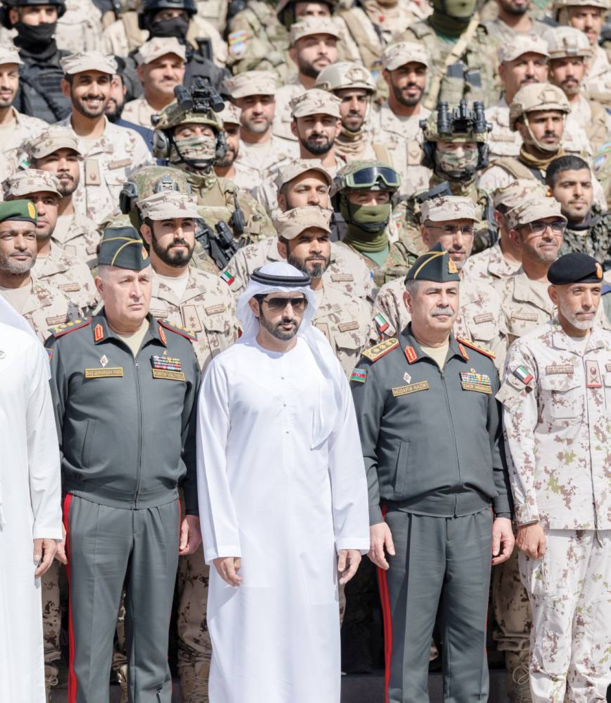 حمدان بن محمد في لقطة جماعية مع القوات المشاركة بالتمرين بحضور ذاكر حسنوف ومحمد المزروعي وكريم ولييف وأحمد بن طحنون وقيادات عسكرية