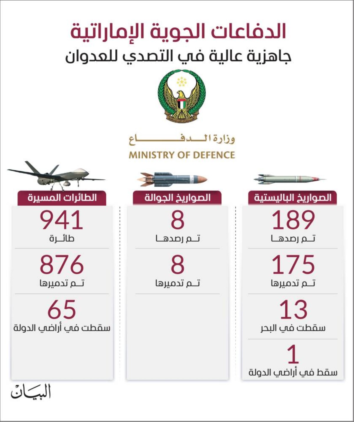 وأوضحت الوزارة أنه منذ بدء الاعتداء الإيراني السافر تم رصد 189 صاروخاً باليستياً تم إطلاقها تجاه الدولة وتم تدمير 175 صاروخاً، فيما سقط 13 منها في مياه البحر، وصاروخ واحد سقط على أراضي الدولة.