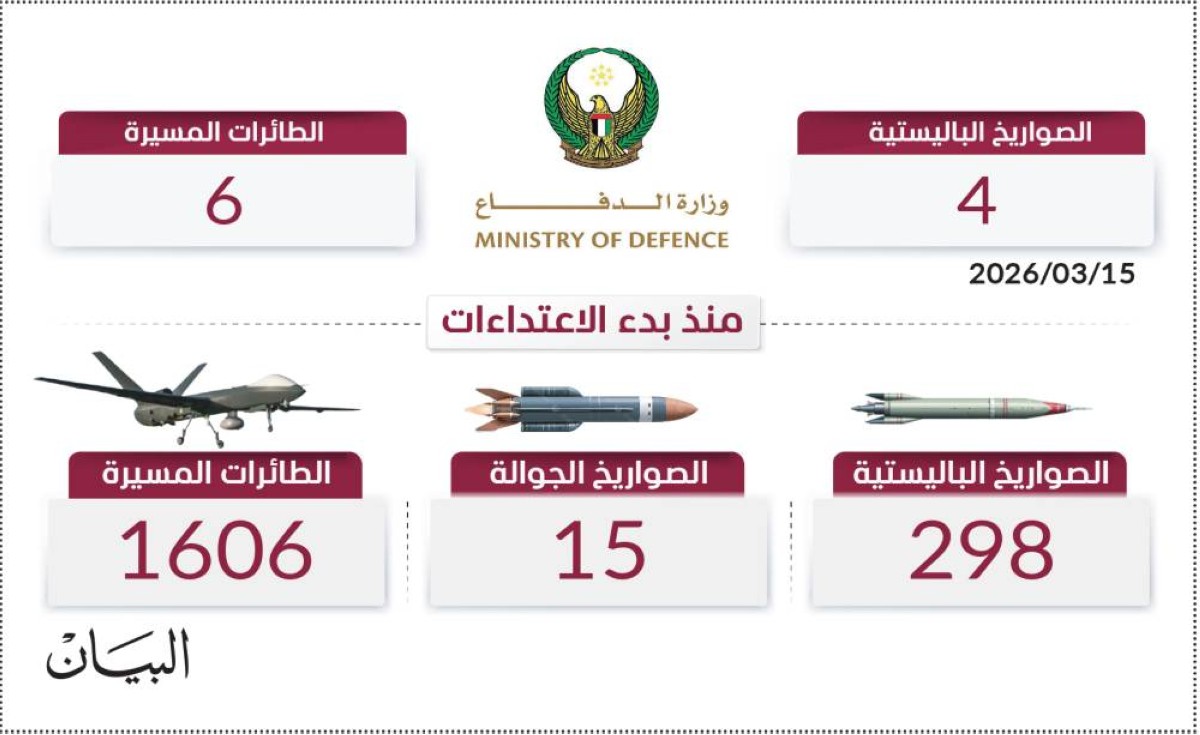 ومنذ بدء الاعتداءات الإيرانية السافرة تعاملت الدفاعات الجوية الإماراتية مع 298 صاروخاً باليستياً، و15 صاروخاً جوالاً، و1606 طائرات مسيّرة بمجموع 1919 صاروخاً ومسيّرة.