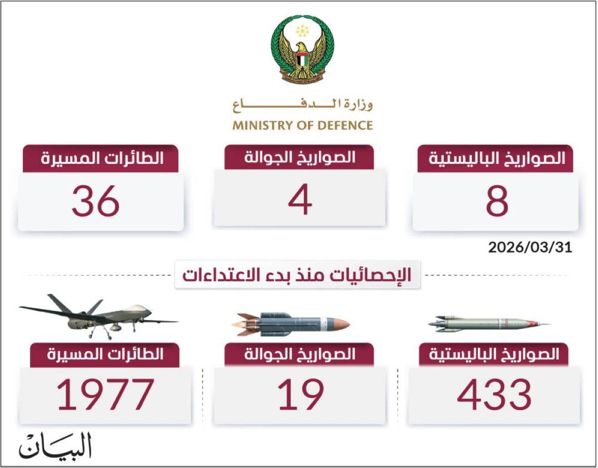 تعاملت الدفاعات الجوية الإماراتية (31 مارس 2026) مع 8 صواريخ باليستية و4 صواريخ جوالة و36 طائرة مسيرة قادمة من إيران.