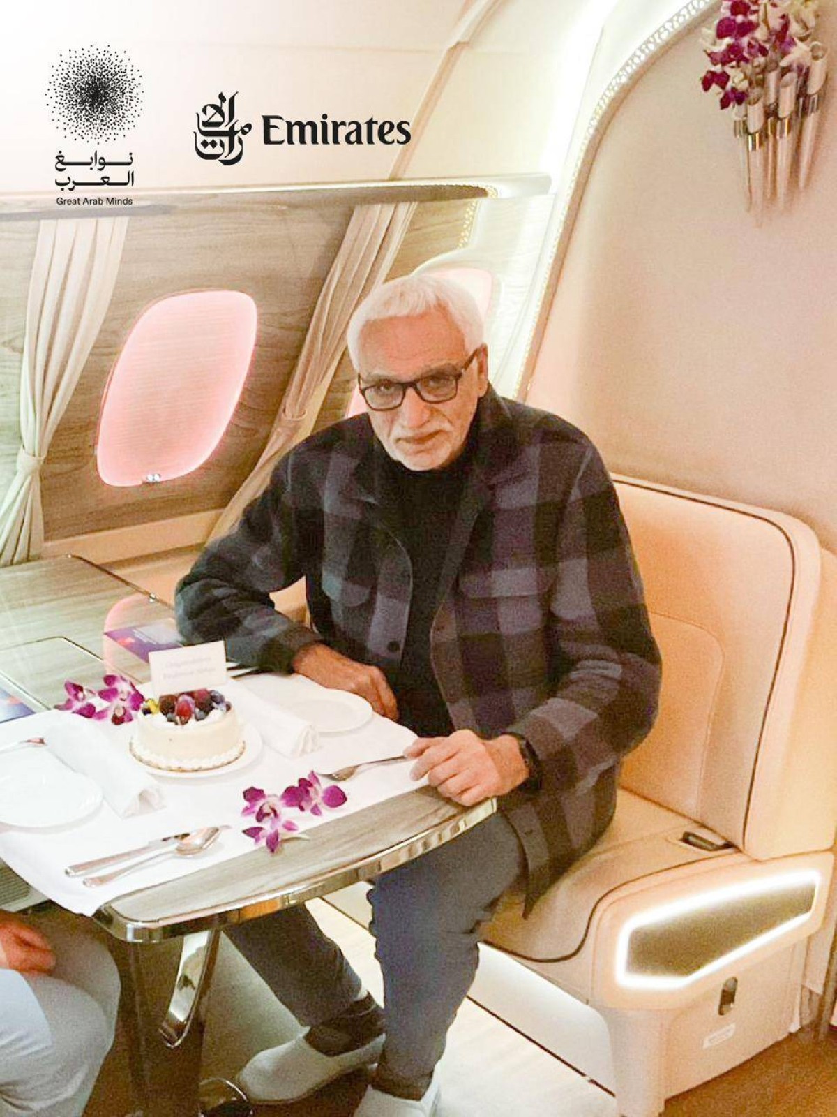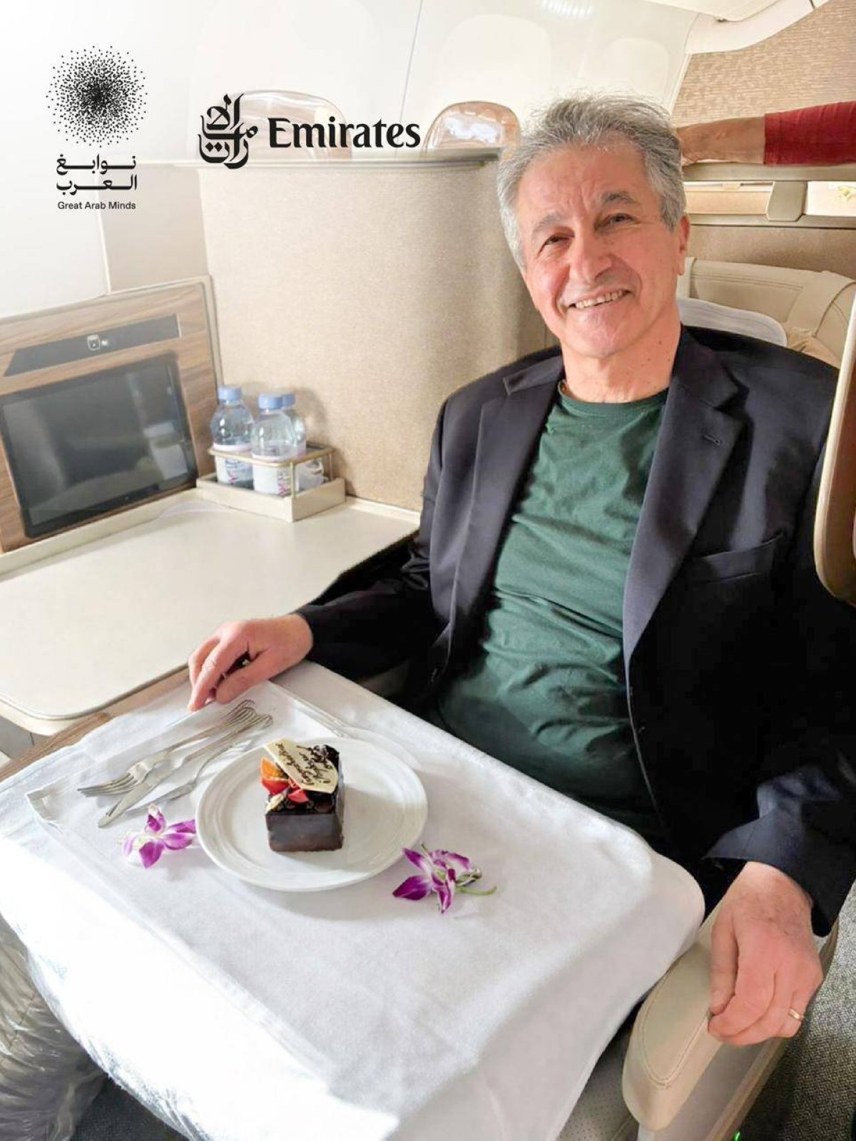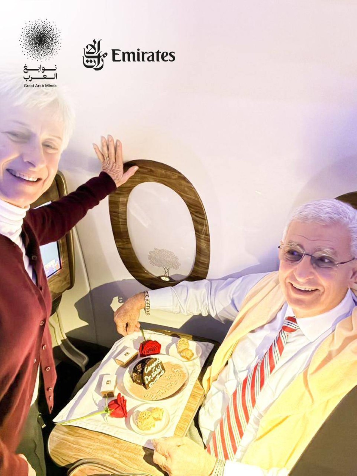 وقدّم طواقم طيران الإمارات في الجو خلال الرحلة قالباً من الحلوى مزيّناً باسم الفائز احتفاءً بتواجده على متنها، كما التقطوا الصور التذكارية معهم وشاركوها في النشرات الدورية ومنشورات صفحات التواصل الاجتماعي لطيران الإمارات في مختلف أنحاء العالم.