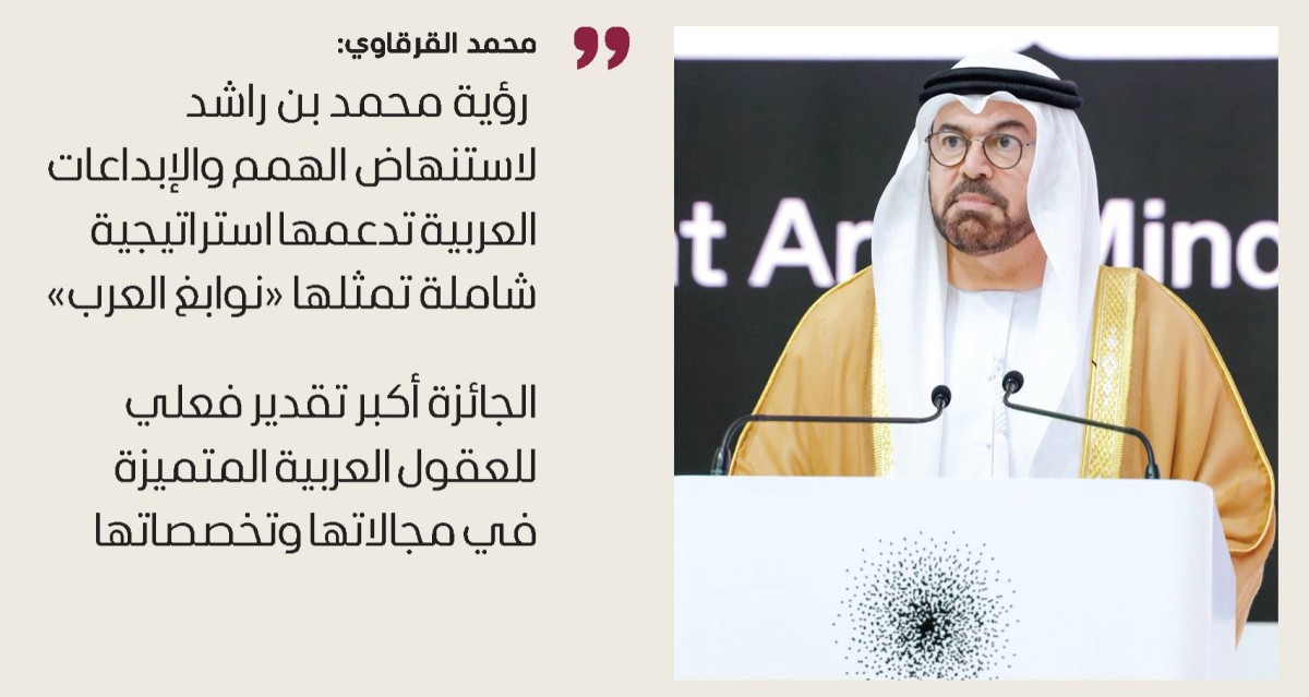 وأشاد معالي محمد عبدالله القرقاوي بما حققه نوابغ العرب في ميادين الطب والهندسة والتكنولوجيا والعلوم والعمارة والفنون والآداب، قائلاً: «إن تكريم (نوابغ العرب 2025) يُعد رسالة محفزة لملايين من الشباب العربي ليخوضوا غمار المنافسة والتميز والنجاح والإنجاز في مختلف ميادين البحث والابتكار والإبداع والمعرفة ويصنعوا بأيديهم مستقبلاً مشرقاً للحضارة العربية والإنسانية».