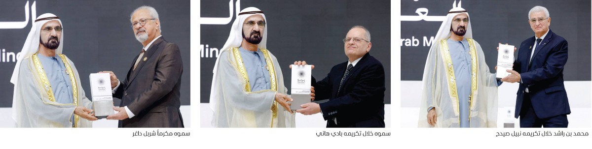 محمد بن راشد خلال تكريم عباس الجمل ونبيل صيدح وبادي هاني وماجد شرقي وسعاد العامري وشربل داغر |