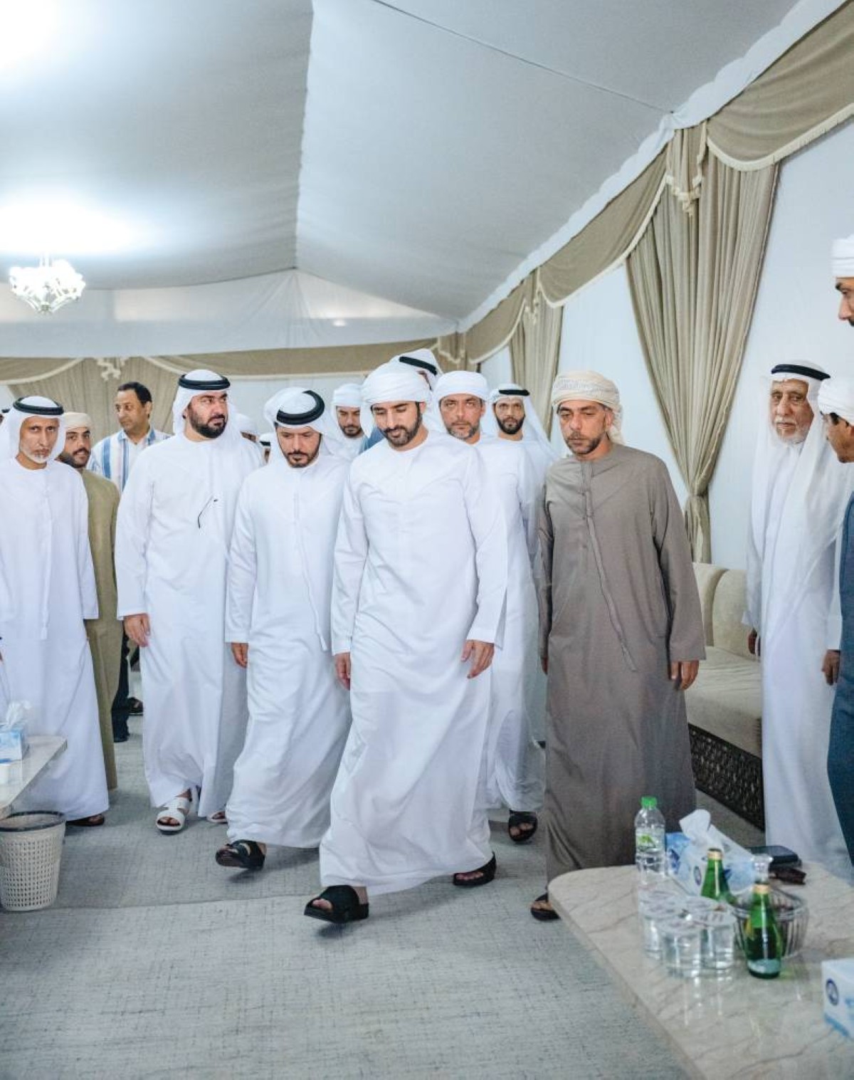 حمدان بن محمد خلال تقديمه واجب العزاء بحضور سعيد آل مكتوم