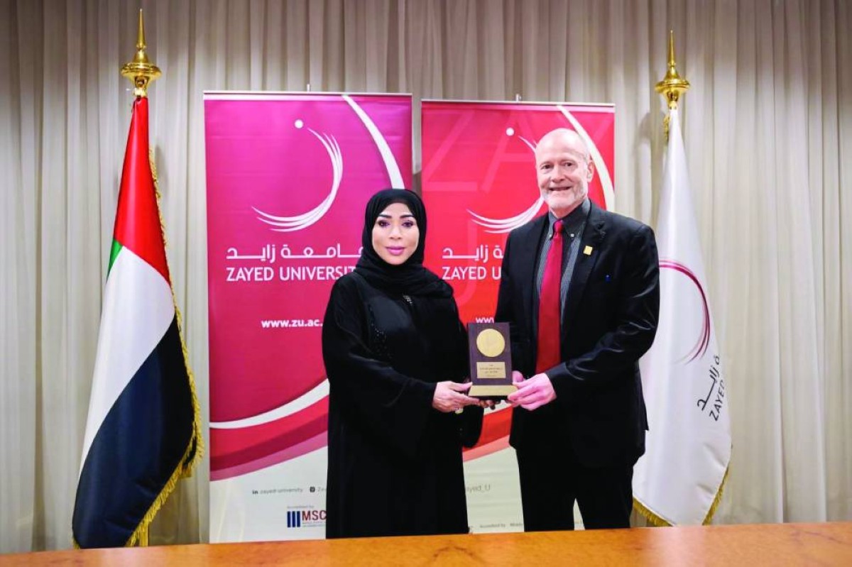 وقع الاتفاقية، فضيلة المعيني رئيس مجلس إدارة جمعية الصحفيين الإماراتية، والدكتور مايكل آلان رئيس جامعة زايد بالإنابة.