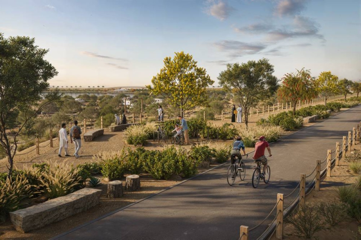 كما يضم 14 كيلومتراً من مسارات المشاة والدراجات الهوائية، منها 4 كيلومترات مسارات علوية بارتفاع خمسة أمتار تتيح إطلالات بانورامية على الواحة، إلى جانب ربطها بالمسارات القائمة في منطقة المرموم.