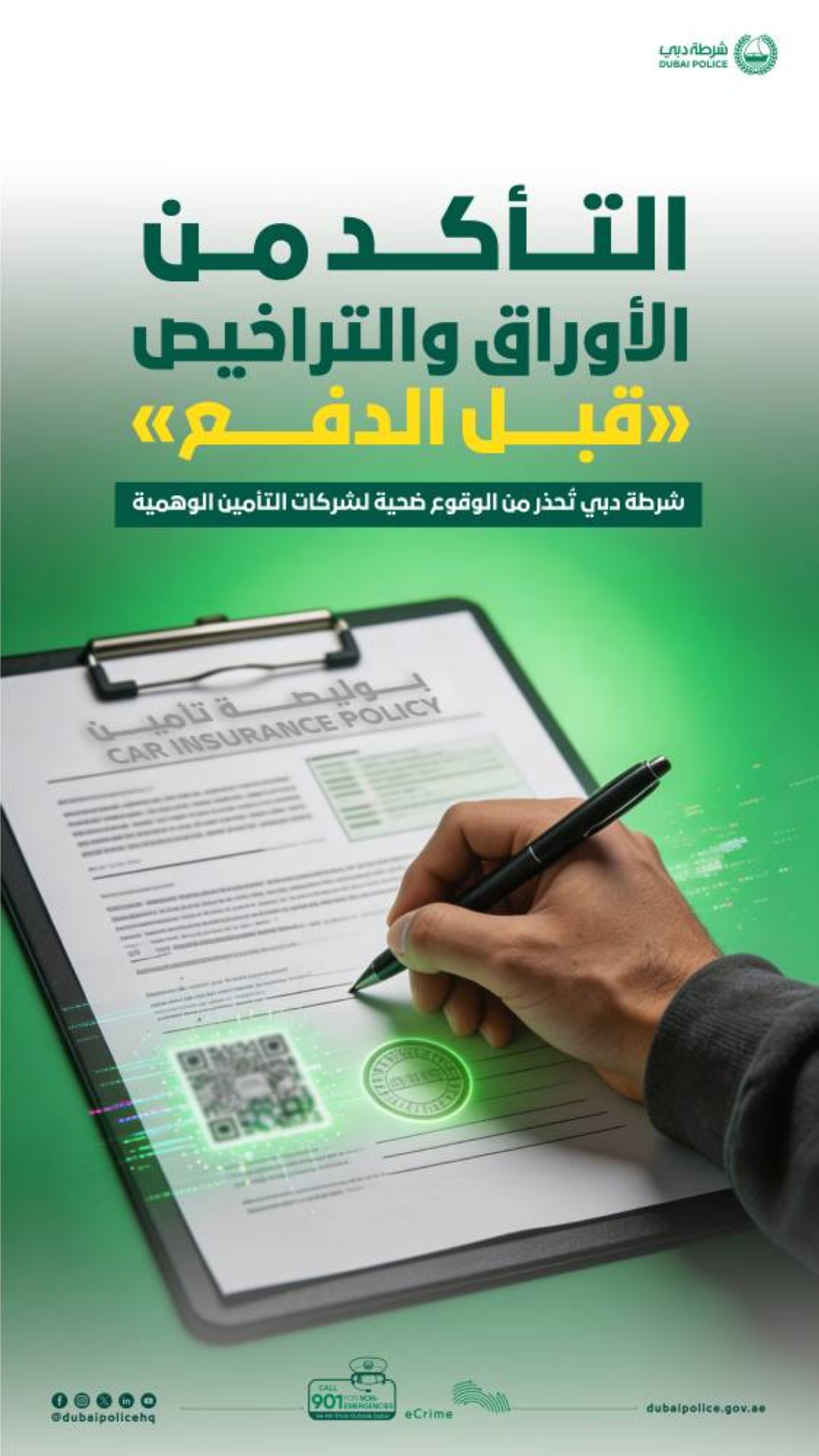 وشددت شرطة دبي على أن شركات التأمين المعتمدة في دولة الإمارات تخضع لإشراف ورقابة الجهات الرسمية المختصة، وتلتزم بإجراءات واضحة لإصدار الوثائق وضمان حقوق العملاء، داعية الجمهور إلى التأكد من ترخيص شركة التأمين أو الوسيط قبل إتمام أي عملية دفع، وعدم الانسياق وراء الإعلانات المضللة أو العروض الجذابة والوهمية التي لا تتناسب مع أسعار السوق المطروحة. وأكدت شرطة دبي حرصها على تعزيز الوعي المجتمعي بمخاطر الاحتيال الإلكتروني، مشيرة إلى أن الجهات الأمنية المختصة تتابع هذه الأنشطة وتعمل على رصدها واتخاذ الإجراءات القانونية بحق القائمين عليها، إلا أن الوعي الفردي يبقى خط الدفاع الأول للوقاية من مثل هذه الجرائم.