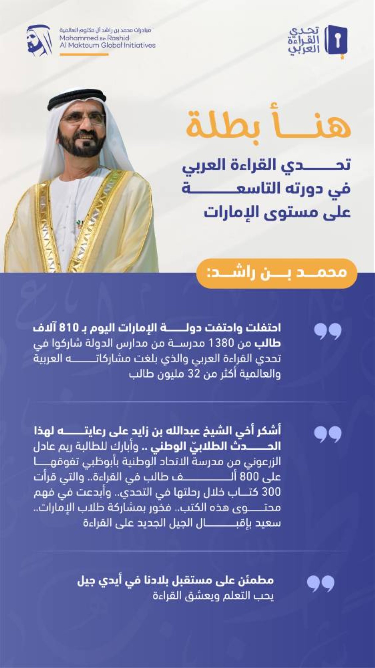 أعرب صاحب السمو الشيخ محمد بن راشد آل مكتوم نائب رئيس الدولة رئيس مجلس الوزراء حاكم دبي "رعاه الله"، عن فخره بمشاركة 810 آلاف طالب وطالبة من مدارس دولة الإمارات في الدورة التاسعة من تحدي القراءة العربي.