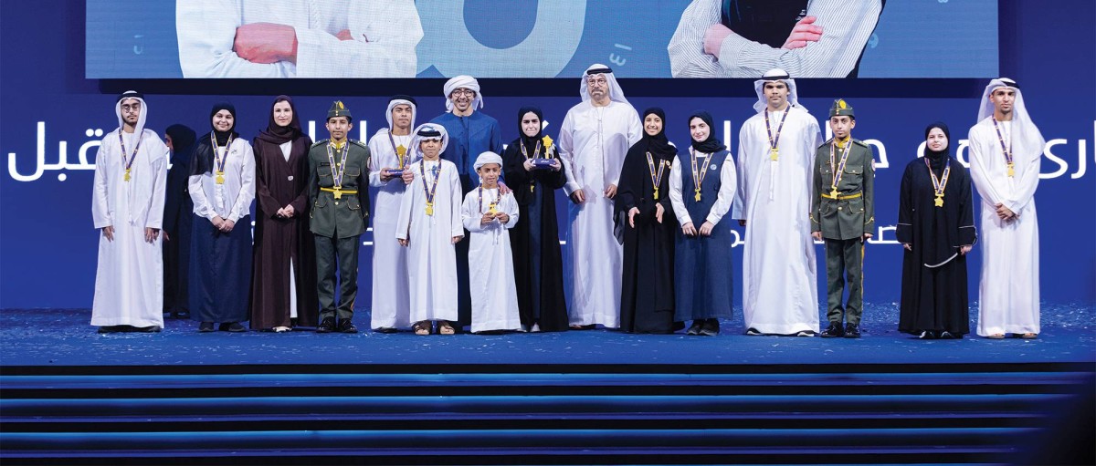 عبدالله بن زايد يتوسط الفائزين بحضور محمد القرقاوي وسارة الأميري