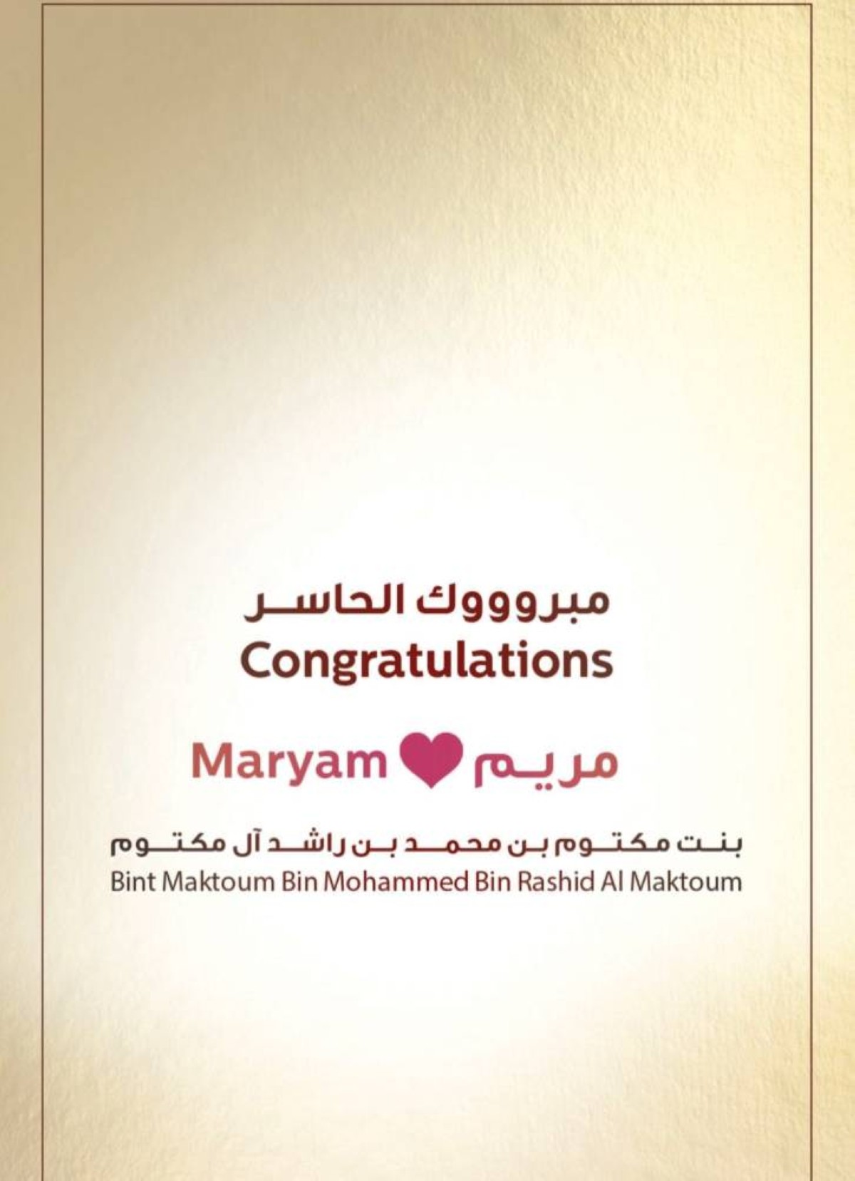 ونشر سموّه عبر حسابه في منصة «إنستغرام»: «مبروك الحاسر، مريم بنت مكتوم بن محمد بن راشد آل مكتوم».