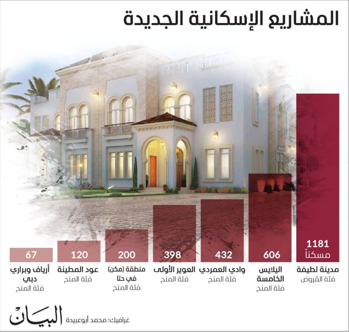 وتشمل خطة المشاريع الإسكانية بناء 3004 مساكن جديدة للمواطنين، بواقع 1181 مسكناً في مدينة لطيفة لفئة القروض، و606 مساكن في اليلايس الخامسة لفئة المنح، و432 مسكناً في وادي العمردي لفئة المنح، و398 مسكناً في العوير الأولى لفئة المنح، و200 مسكن في منطقة (مكن) في حتا لفئة المنح، و120 مسكناً في عود المطينة لفئة المنح، و67 مسكناً في مناطق أرياف وبراري دبي لفئة المنح، وتوفر المشاريع الإسكانية خيارات جديدة ومتنوعة للمواطنين.