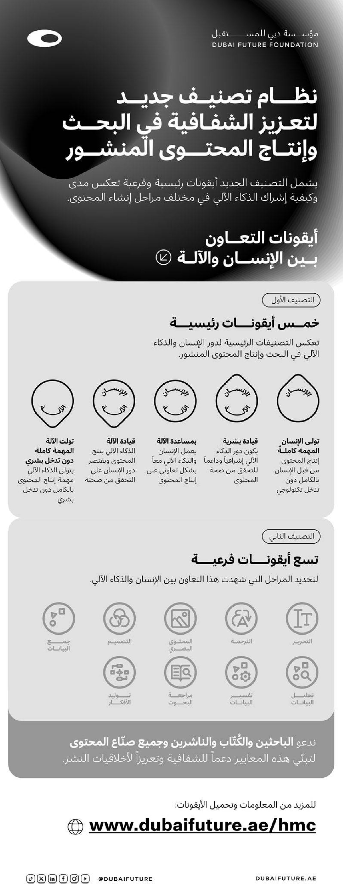 ويهدف إطلاق نظام الأيقونات التصنيفية العالمي الذي طورته مؤسسة دبي للمستقبل إلى توضيح مدى التعاون بين الإنسان والذكاء الآلي (Human-Machine collaboration) في تعزيز الشفافية في البحث العلمي وتوفير وسيلة واضحة تتيح للقرّاء والباحثين وصنّاع القرار رؤية تأثير استخدام الذكاء الآلي في مجالات إنتاج المحتوى والتصميم والنشر والتي ستعتمد بشكل أكبر على التكنولوجيا في المستقبل.