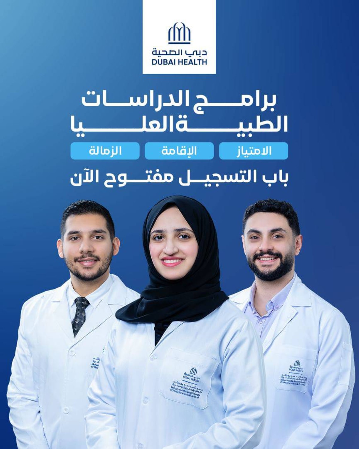 أعلنت «دبي الصحية» عن فتح باب التسجيل في برامج الدراسات الطبية العليا «الامتياز والإقامة والزمالة» في جامعة محمد بن راشد للطب والعلوم الصحية، وتضم للمرة الأولى برنامجي الزمالة في «طب الكلى للأطفال وطب السكتة الدماغية»، بهدف توفير كوادر طبية عالية الكفاءة في التخصصات الدقيقة، وتعزيز جودة التعليم الصحي.