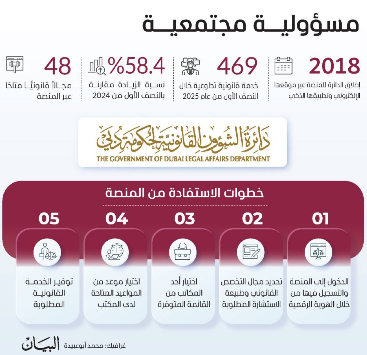 وأوضحت الدائرة أن المنصة التي أطلقتها عام 2018 عبر موقعها الإلكتروني وتطبيقها الذكي، في إطار مسؤوليتها المجتمعية الرامية إلى دعم مشاركة قطاع المهن القانونية في العمل التطوعي، يشارك فيها 395 محامياً ومستشاراً قانونياً من المقيدين لديها، مشيرةً إلى أن المنصة تتيح لمستخدميها 48 مجالاً قانونياً.