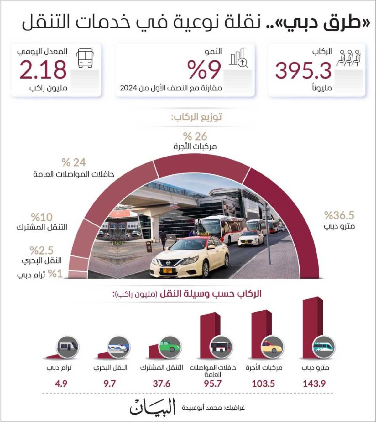 أعلنت هيئة الطرق والمواصلات في دبي أن عدد مستخدمي وسائل النقل الجماعي، التي تشمل مترو دبي وترام دبي وحافلات المواصلات العامة ووسائل النقل البحري، إضافة إلى عدد مستخدمي مركبات الأجرة، ووسائل التنقل المشترك (مركبات شركات التطبيقات الذكية، ومركبات التأجير بالساعات، والحافلات عند الطلب)، خلال النصف الأول من عام 2025 نحو 395.3 مليون راكب، مقارنة بنحو 361.2 مليون راكب في النصف الأول من عام 2024، مسجلاً نمواً بنسبة 9 %، وبلغ المتوسط اليومي لعدد الركاب في النصف الأول من العام الجاري قرابة 2.18 مليون راكب، مقارنة بنحو 1.98 مليون راكب في الفترة نفسها من عام 2024.