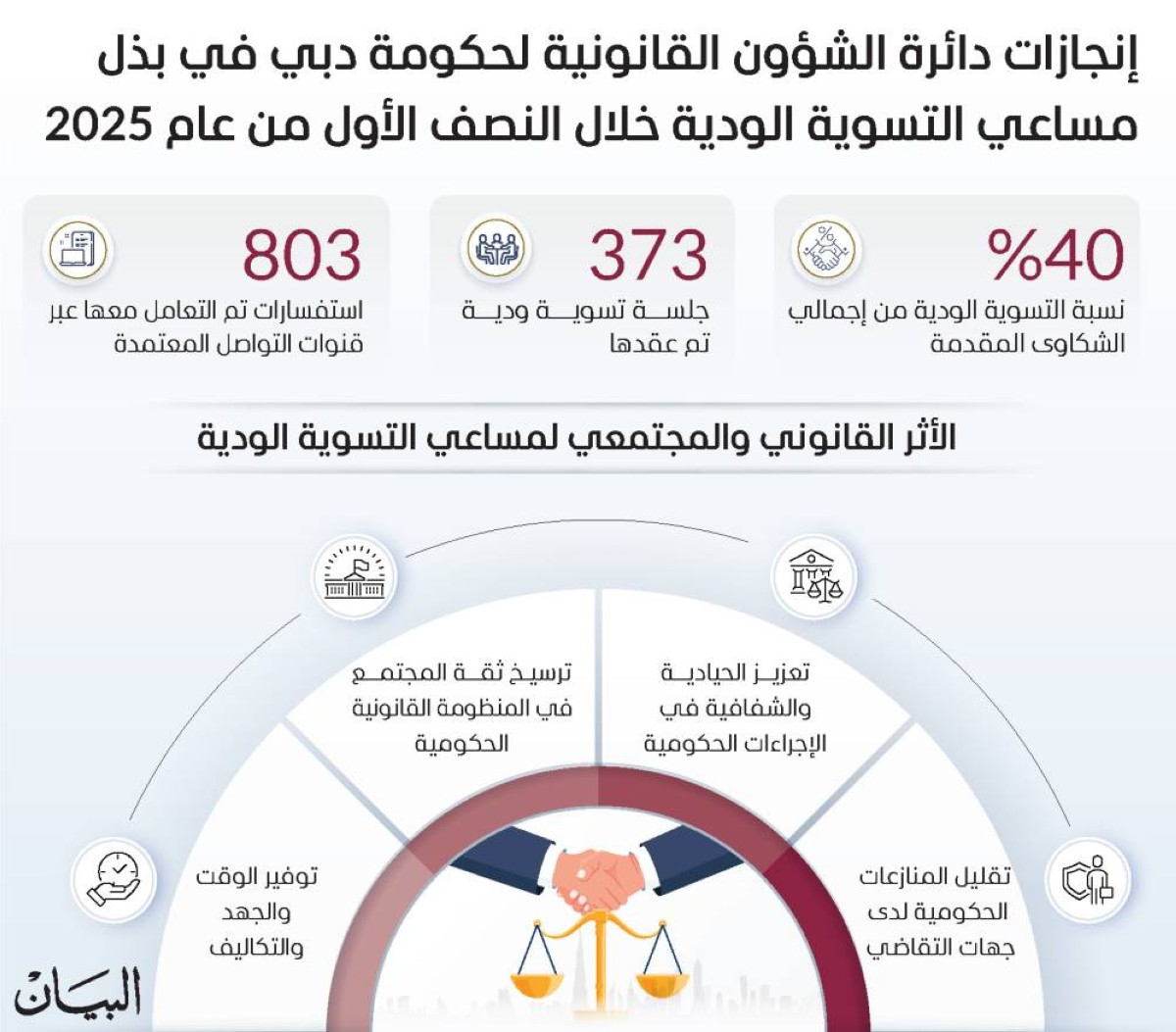 حيث يتم بذل مساعي التسوية الودية وصولاً إلى توافق وحل ودي للنزاع، لتجنُّب اللجوء للتقاضي قدر الإمكان، من خلال عملية تفاوضية تقدم حلولاً مقبولة لدى الطرفين، تضمن الحقوق وترسخ قيم العدالة والامتثال لأحكام القانون، وذلك تماشياً مع نهج دبي الراسخ في تعزيز ثقة المجتمع في المنظومة القانونية بالإمارة.