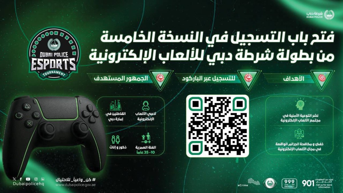 أعلنت القيادة العامة لشرطة دبي عن فتح باب التسجيل في فعاليات النسخة الخامسة من بطولة شرطة دبي للألعاب الإلكترونية، التي ستُقام يومي 17 و18 من أغسطس المقبل، في نادي ضباط شرطة دبي بمنطقة الجداف.