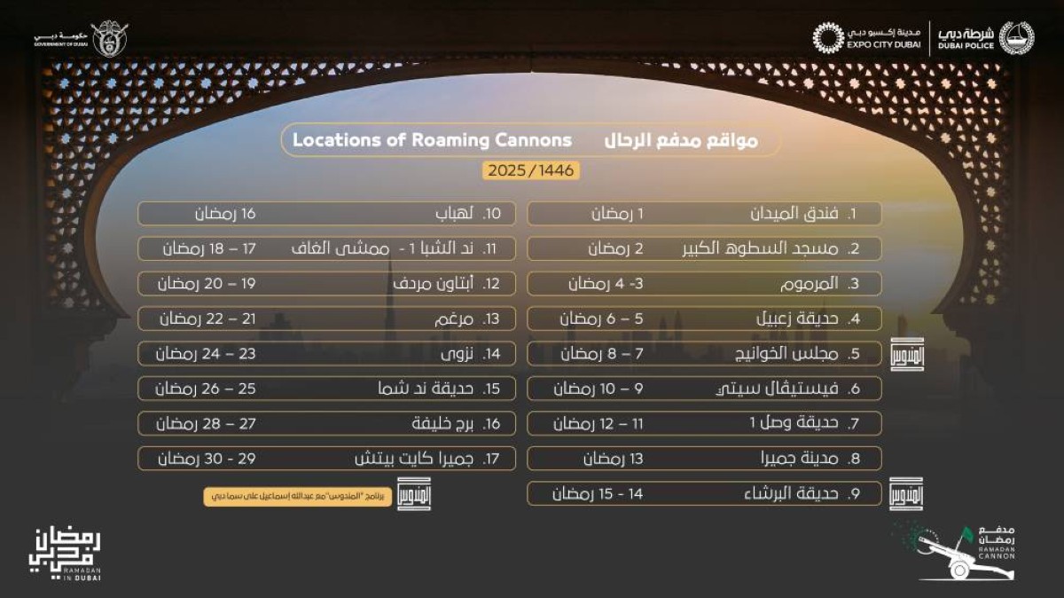 أعلنت القيادة العامة لشرطة دبي، اليوم، عن أماكن مدافعها خلال شهر رمضان المبارك، موضحة أن هناك 8 مدافع ثابتة ستكون موزعة في مختلف أرجاء دبي، في حين سيكون هناك مدفع "رّحال واحد" يتنقل طوال الشهر الفضيل في 17 منطقة على مستوى الإمارة.