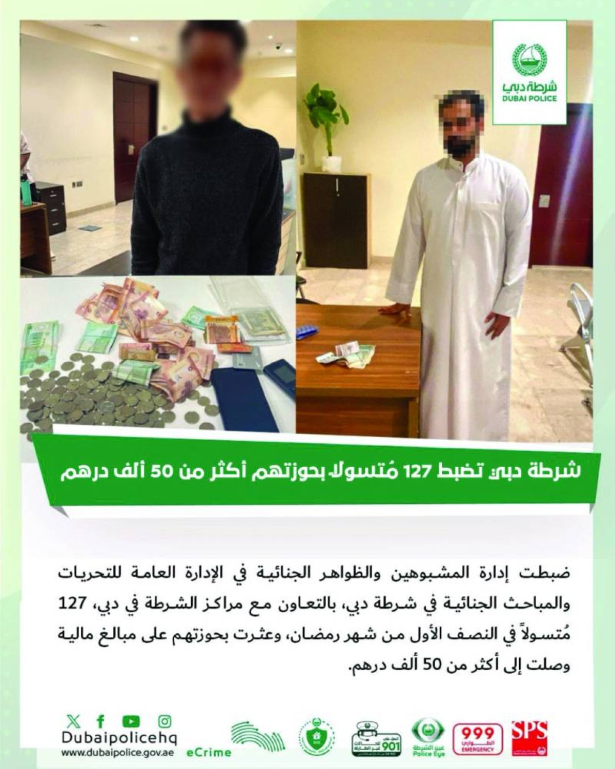 شرطة دبي تضبط 127 متسولاً بحوزتهم 50 ألف درهم