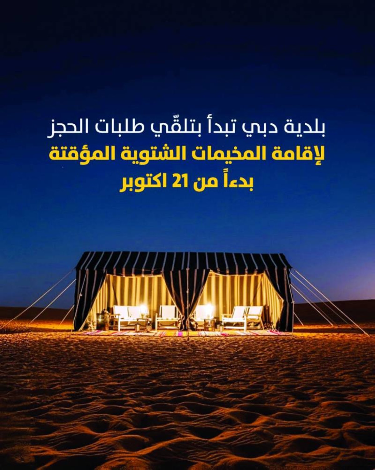أعلنت بلدية دبي إطلاق موسم التخييم الشتوي المؤقت في الإمارة بدءاً من يوم الاثنين المقبل الموافق لـ21 أكتوبر الجاري، والذي سيستمر حتى نهاية أبريل 2025، حيث حددت موقع المخيمات الشتوية المؤقتة لهذا العام في منطقة العوير. وحرصت البلدية على التأكد من توفير بيئة تخييم عائلية آمنة مناسبة لقضاء تجربة تخييم صحراوية متميزة والاستمتاع بالأجواء الشتوية في الإمارة.