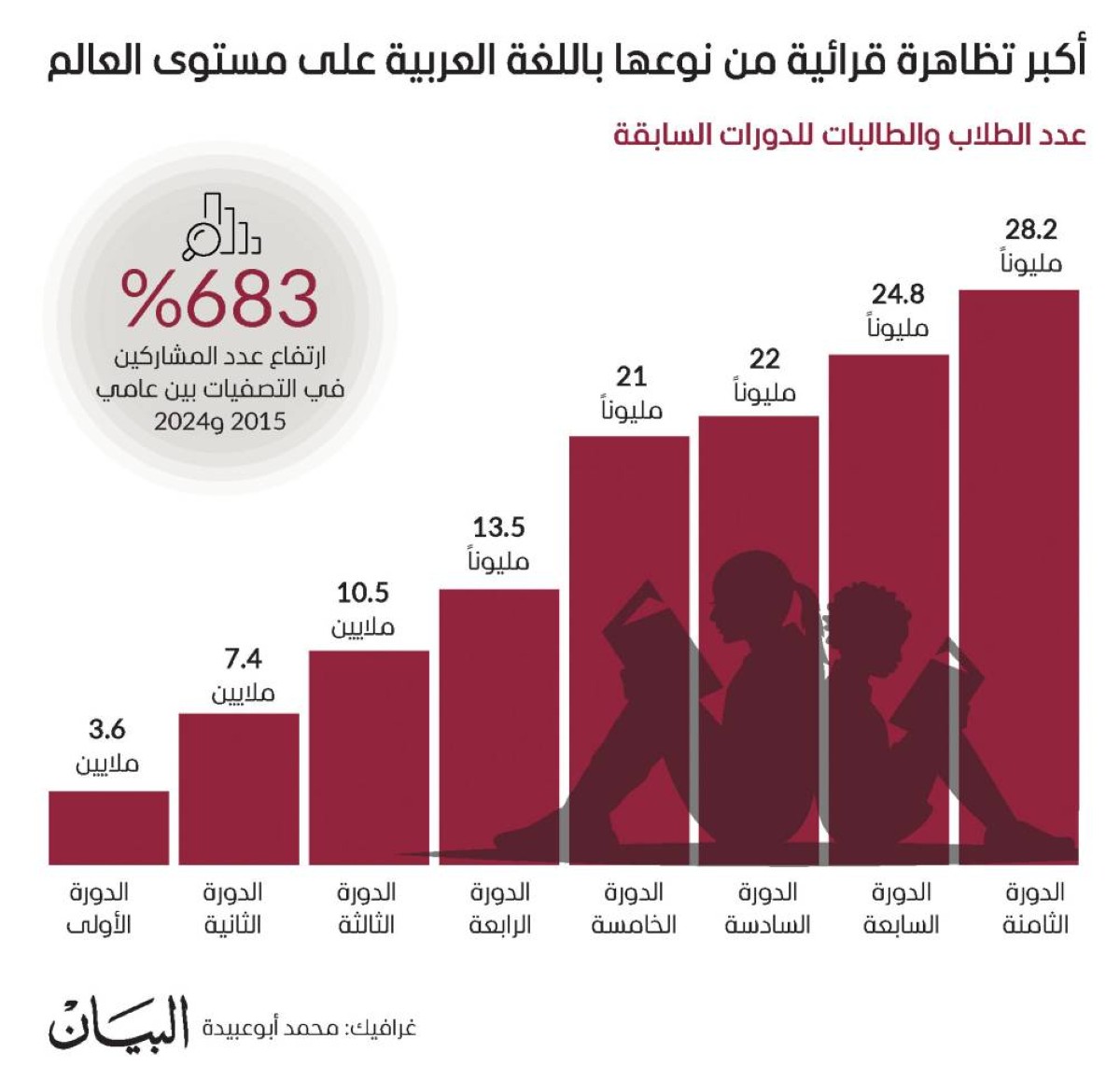 حيث وصل عدد المشاركين في تصفياتها إلى أكثر من 28.2 مليون طالب وطالبة، بارتفاع قدره 683 % عن الدورة الأولى، ليبلغ إجمالي عدد الطلبة المشاركين في ثماني دورات، أكثر من 131 مليون طالبة وطالبة، وقد تحقق هذا الإنجاز من خلال التفاعل الكبير الذي أبداه طلبة الدول العربية، وأبناء الجاليات العربية حول العالم.