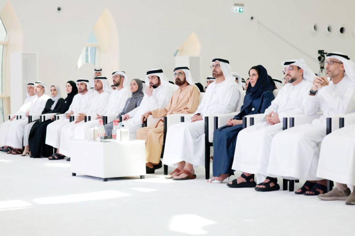 محمد بن راشد خلال اللقاء بحضور أحمد بن محمد ومحمد القرقاوي وعهود الرومي وعمر العلماء ومريم الحمادي